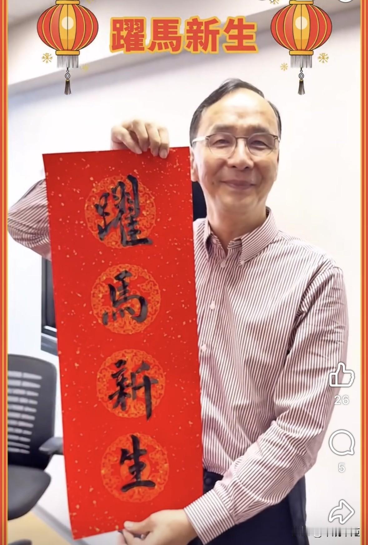 国民党前主席朱立伦,今(16日)除夕表示,他写下“跃马新生”,希望大家在马年都能如骏马奔腾,拥有崭新的生命力与活力! 除了给年轻人的鼓励,他也写下了“智韬经略开太平,马到成功展新生”这副对联。这是对台深切期许,盼望未来能以宏观的智慧与布局治理,让社会享有真正的平安与祥和。 祝福每一位好朋友,阖家平安,新年快乐!