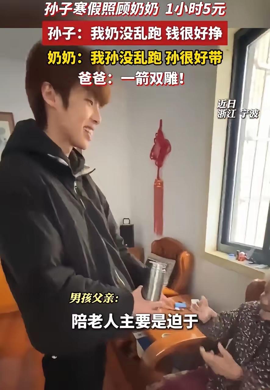 笑死了!浙江宁波,一大学生放假回家没事干,父亲就给他安排了一个工作,就是去照顾97岁的奶奶,而且是有工资的,一天50块钱。而奶奶并不知道他是来赚钱的,还以为是儿子把孙子送来让自己照顾,双方都觉得对方很好带。 21岁的大小伙子,寒假往家里一躺,本来以为又要听爸妈唠叨“整天抱着手机不撒手”,结果他爸直接递过来一个美差:去,陪你奶奶去,一天给你五十。 这事火遍网络后,网友们边笑边感慨,这大概是寒假最舒服的临时工作,没有之一。21岁的大学生刚脱离校园的紧张节奏,回到家本就想彻底放松,可假期待得越久,越容易被父母的唠叨包围,睡懒觉、刷手机、不出门,每一件事都能成为被念叨的理由。这位父亲没有选择说教,也没有逼着孩子去做兼职,反而把陪伴老人变成了一份有报酬的事,一下子就戳中了年轻人的心思。 大学生刚答应下来的时候,心里还偷偷窃喜,以为照顾老人会有各种麻烦,真正开始陪伴才发现,97岁的奶奶生活格外规律。每天只需陪着老人坐在客厅晒晒太阳,听老人念叨几句陈年旧事,偶尔帮老人递杯温水、拿点零食,就算完成了全部工作。没有繁重的家务,没有复杂的要求,全程轻松又自在,他打心底里觉得,奶奶实在是太好带了。 奶奶的想法和孙子完全相反,她自始至终都不知道孙子是来“上班赚钱”的。在老人的认知里,是儿子心疼自己孤单,特意把孙子送来让自己照看。97岁的年纪,身边能有个年轻孩子陪着,本就是天大的欢喜,她总想着把家里最好吃的零食、水果都拿给孙子,生怕孩子待着无聊,又怕孩子受一点委屈。在奶奶眼中,这个21岁的孙子乖巧又安静,不吵不闹也不挑食,比想象中好带太多。 这种错位的认知,没有造成任何尴尬,反而成了最动人的温情。当下很多家庭都面临着同样的问题,年轻人一放假就扎进手机里,和长辈的交流少得可怜,高龄老人独自在家,最大的遗憾就是身边没人说话。这位父亲看得通透,他知道单纯要求孩子陪伴,只会让年轻人觉得抵触,用50块钱的日薪做纽带,既让孩子有了主动陪伴的动力,又让老人的晚年有了温暖的依靠。 大学生在陪伴的过程中,也慢慢放下了对手机的依赖。他开始认真听奶奶讲过去的故事,了解那些从未知晓的家族过往,感受老人历经岁月沉淀后的平和。这份看似简单的“工作”,带给他的远不止每天50块钱的收入,更多的是和亲人相处的珍贵时光,是藏在日常里的亲情温暖。 网友们纷纷表示,这才是家庭相处的最佳方式,没有矛盾,没有强制,用最轻松的方式实现了双向治愈。年轻人摆脱了假期的懒散和父母的唠叨,老人驱散了独居的孤独和寂寞,父亲用一个小小的安排,解决了整个家庭的小烦恼。 这件看似搞笑的小事,藏着最朴实的亲情道理。陪伴从来都不是刻意的任务,当爱以轻松的方式存在,就能让家人之间的关系变得格外融洽。 各位读者你们怎么看?欢迎在评论区讨论。