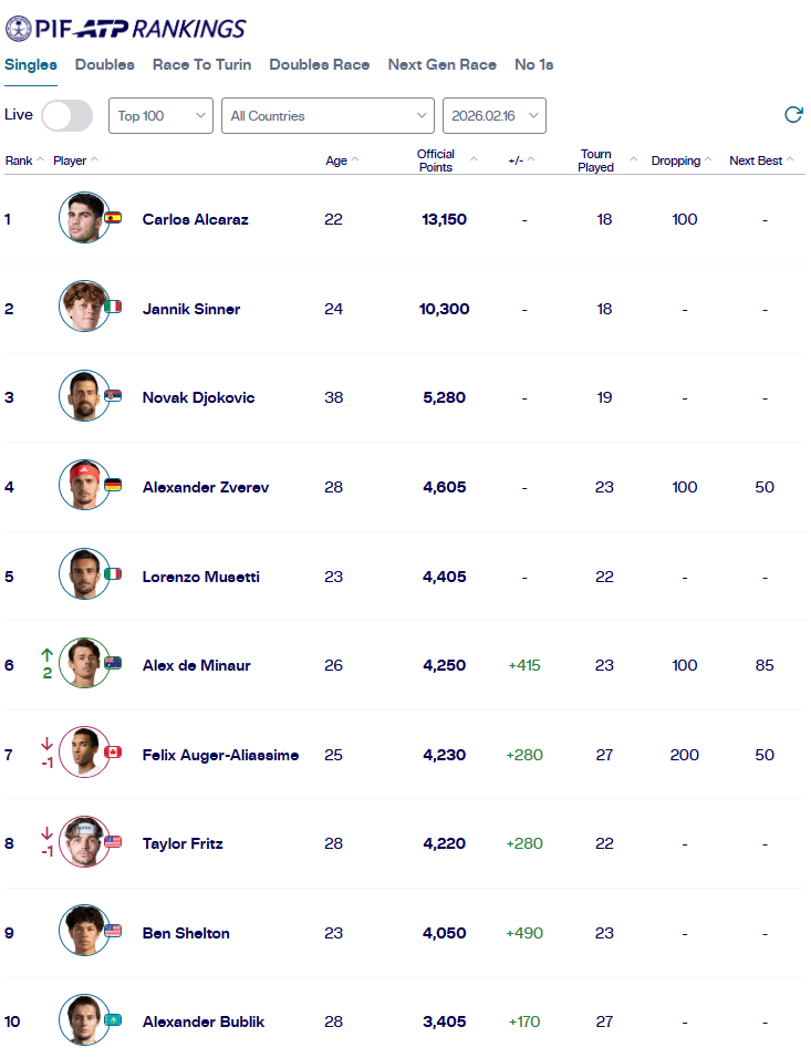 虎扑02月16日讯最新一期的ATP世界排名更新,前5的选手均未参加巡回赛,排名没有变化。本周ATP500鹿特丹公开赛夺冠的德米纳尔回到第6,阿利亚西姆和弗里茨均下降1位。