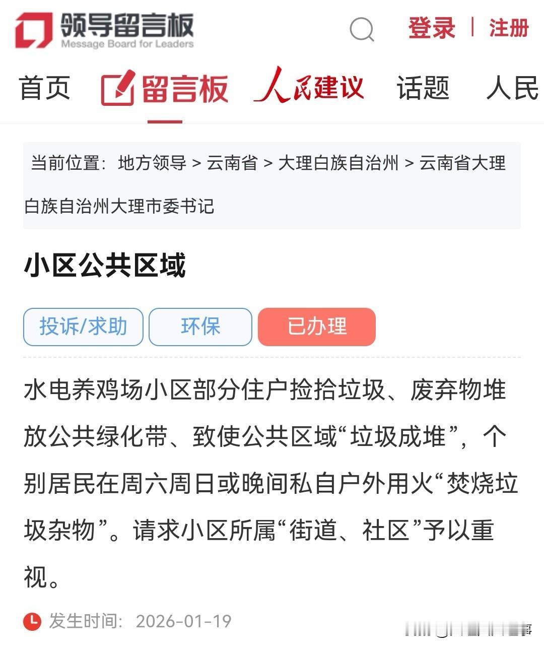 大理网民关注小区脏乱差问题,政府部门联动整治成效初显。 1月19日,大理网民通过人民网领导留言板向大理市委书记留言反馈,小区公共区域杂乱不堪。水电养鸡场小区部分住户捡拾垃圾和废弃物,堆放在公共绿化带,导致公共区域“垃圾成堆”。个别居民还在周六、周日或晚间私自户外用火“焚烧垃圾杂物”,希望小区所属的“街道、社区”能够重视。 事件发生时间为2026年1月19日 2月11日19:01分大理市人民政府太和街道办事处官方回复称,经核实,信访人反映的水电养鸡场小区并不属于下关街道辖区。 网民同志,您于2026年1月20日反映的事项已收悉,现将有关情况回复如下: 经查,社区接到信访件后,多次拨打信访人预留电话,均未接通,因此无法进一步核实具体细节。经实地调查,信访人所反映的情况基本属实,该小区为水电局职工宿舍。 发现问题后,街道和社区积极开展工作: 一是主动联系水电局,及时反馈该小区存在的环境问题,并商请该局切实履行管理责任,加强小区日常环境的巡查、管理和维护。 二是统筹人力物力,对小区的垃圾堆放点开展不定期清理,加大日常巡查力度,及时制止焚烧垃圾等违规行为,改善小区环境卫生状况。 三是持续推进小区的环境卫生宣传工作,通过入户宣讲、张贴公告等多种方式,增强居民的环保意识,引导居民自觉维护公共环境卫生。 感谢您对我们工作的支持与理解,祝您身体健康,生活愉快!