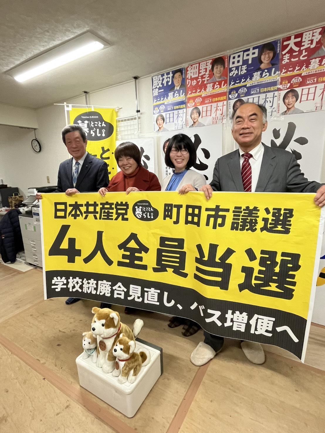 日本共产党在町田市议会选举中推出的4人全部当选! 町田市是位于日本关东地方南部、东京都多摩地方西南部的城市。往东京都特别区部的通勤率为22.1%。该市虽然在政区上属于东京都,但因市区中心与东京都其它地区之间有丘陵隔开,因此反而是和相邻的神奈川县往来密切。町田市亦是日本唯一和3个政令指定都市接壤的自治体。不少知名日本足球运动员出身于该市,有“足球王国”的美誉。
