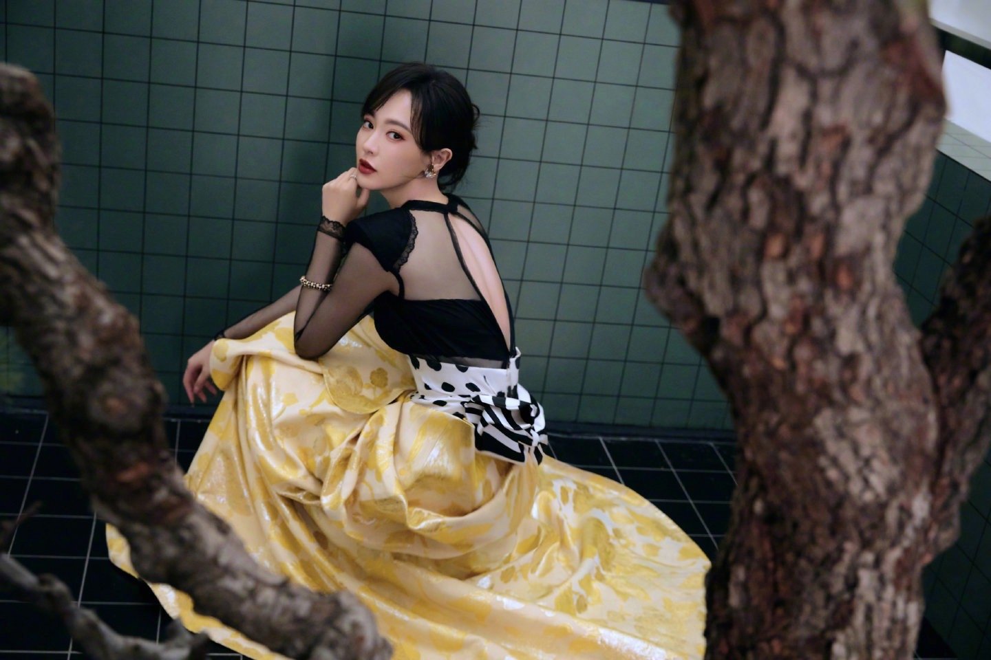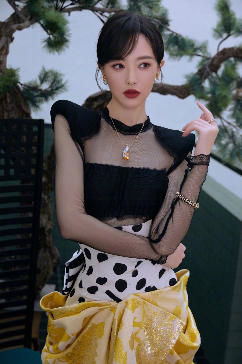 唐嫣新春大片,身穿Ronald van der Kemp 2025秋冬高级定制系列,黑色蕾丝拼接透视薄纱,大面积金色提花缎面鱼尾长裙,搭配Tiffany & Co. 高级珠宝,整体风格华丽、复古又不失现代感,堪称“新春高定美学”的典范。春晚新春茶话会