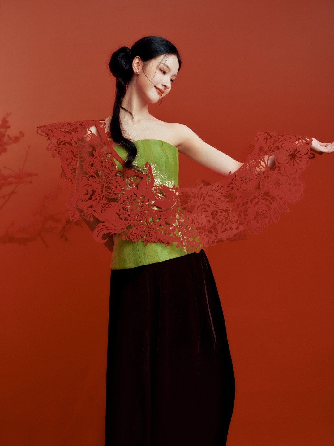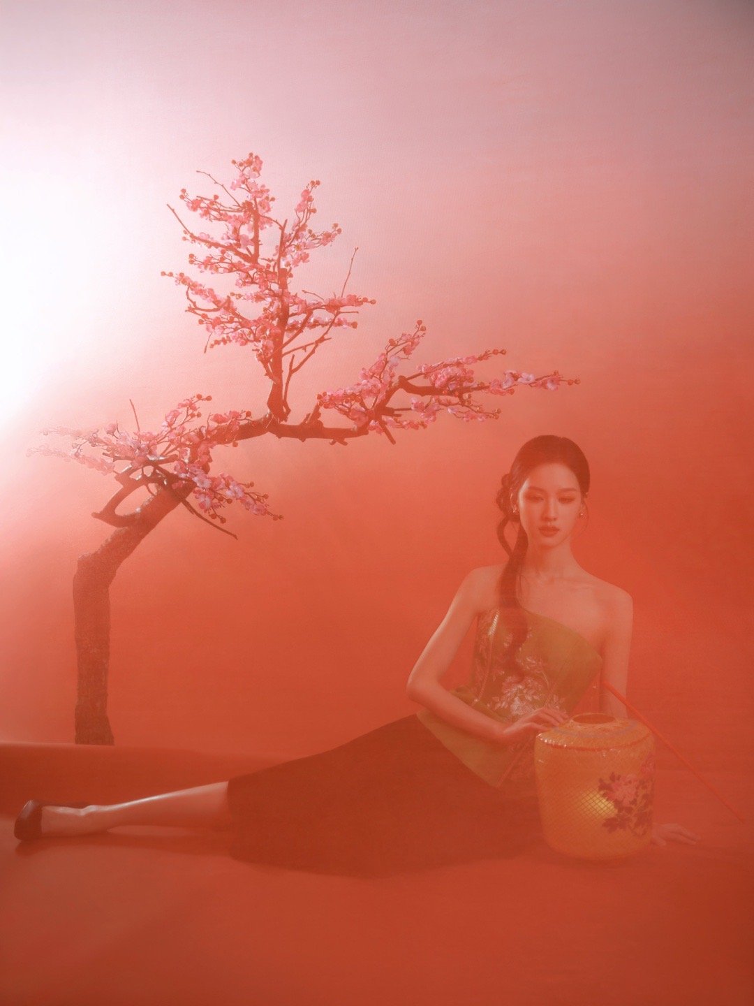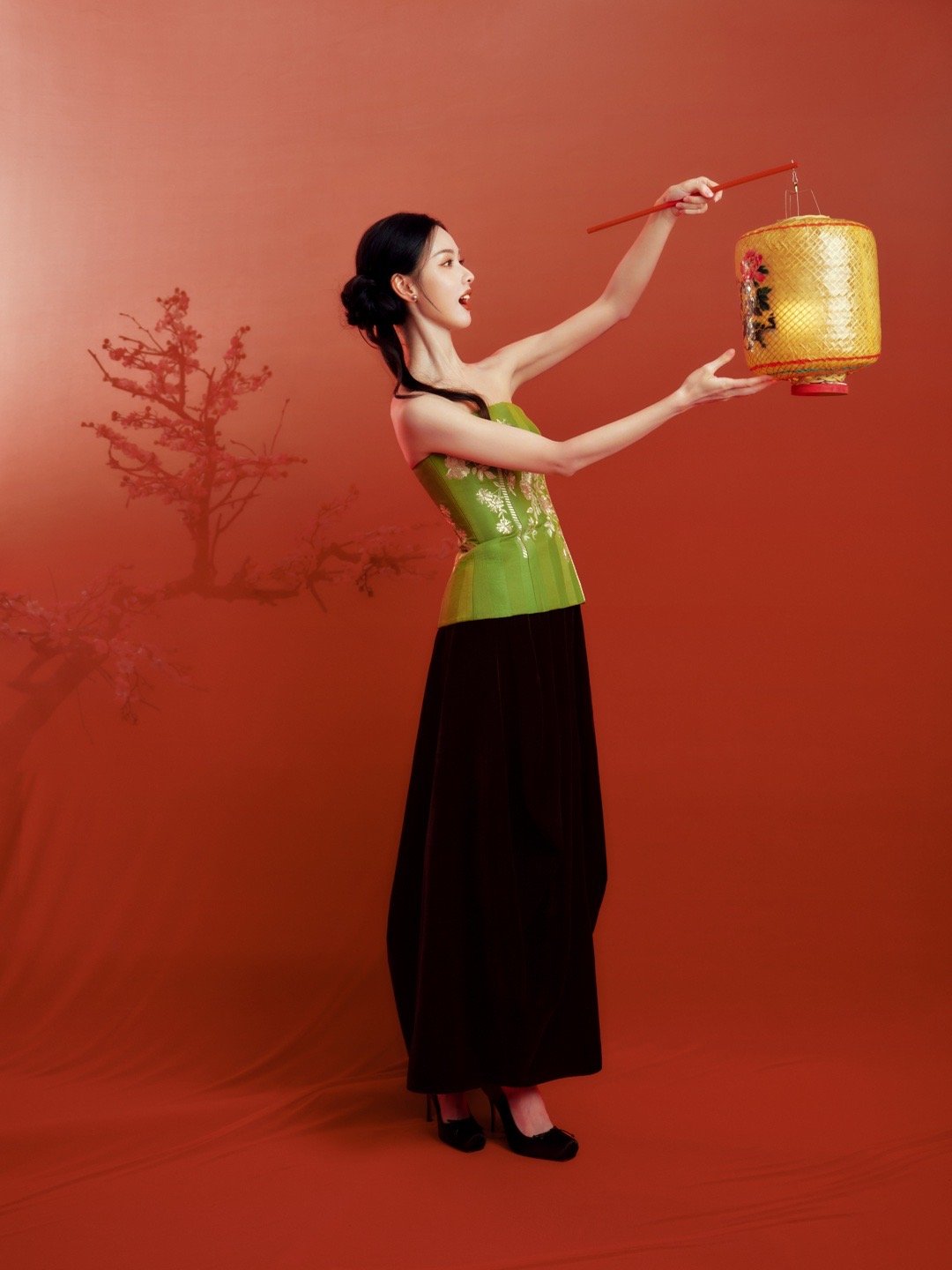 身穿新中式设计师品牌 LA MAISON JADE 2026早春系列出镜贺岁大片,红绿相间,清雅脱俗,以东方之姿庆马年吉祥,新春万事「都灵」~🏮