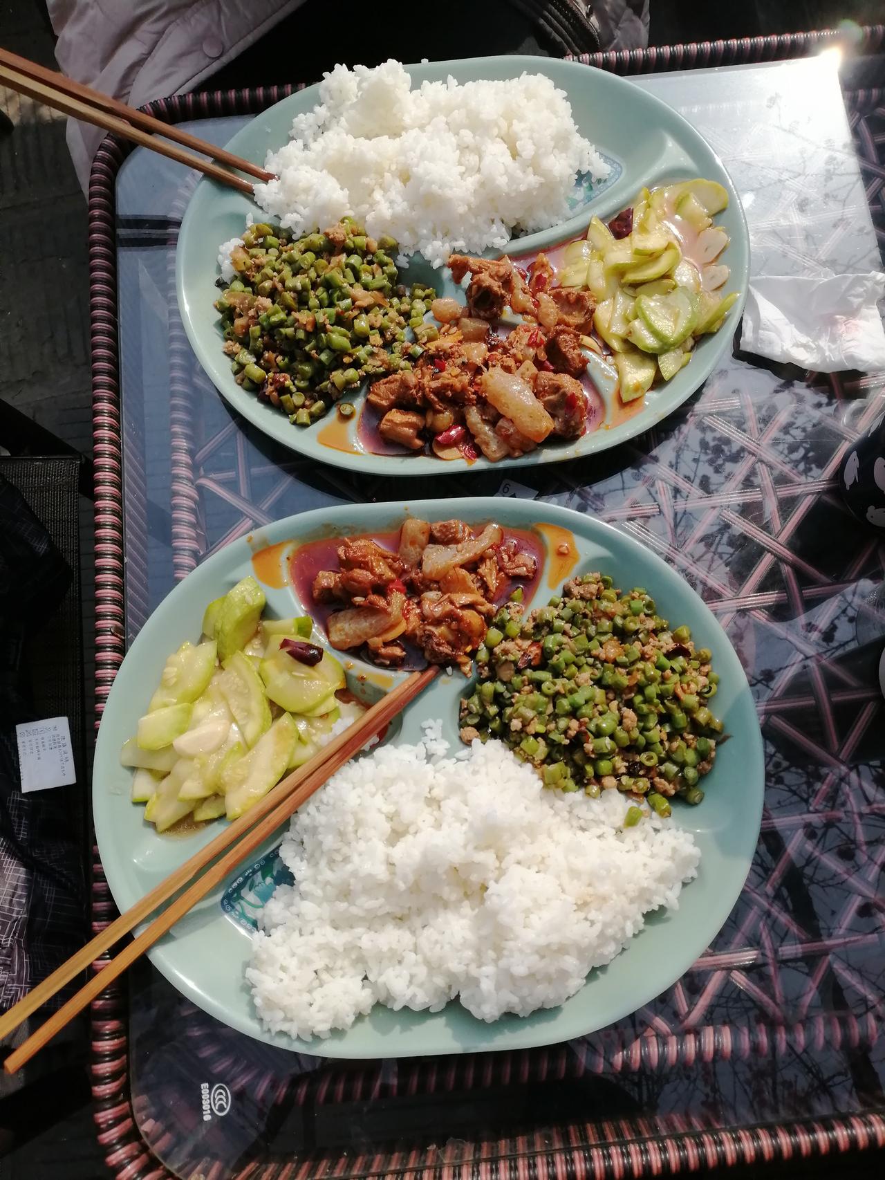 春节茶园不涨价! 今天是大年三十,成都公园里的茶园照常营业。虽说比平时冷清了不少,但只要你敢开门,就有茶客按时来打卡。 不同于春节期间酒店饭馆价格暴涨,成都的茶园不涨价。和平时一样,25元一个人,包含中午一顿自助盒饭(管吃饱),外加一杯盖碗茶,可以闲坐一整天。 今天的菜品是: 魔芋烧鸭肉 + 酸豆角炒肉末 + 炒西葫芦片 + 咸菜(如图) 年味淡了,但茶味依然浓烈!