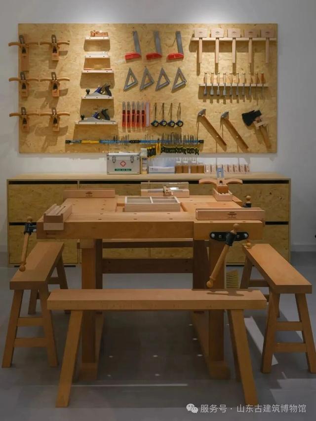 木工工坊传承传统榫卯工艺与实木手作文化。依靠锛、凿、斧、锯等传统工具,完成木作成品。木工工坊集文创售卖(鲁班锁、榫卯结构、梁架衔接),手工制作(刨花灯、竹蜻蜓、发簪)、体验教学于一体。通过手作体验与课程,领悟工匠精神,在一凿一斧间感受中国传统木艺的智慧与温度,学习古建筑知识。在秉承原木选材、精工细作之余,还可以从传承古法技艺角度打造兼具实用与美感的木艺作品。