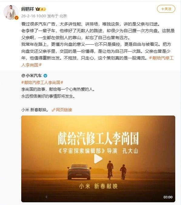 小米汽车这条短片没讲参数、没秀科技,就拍了汽修师傅李尚国的故事,真是让我们狠狠共情了。阎鹤祥说得很好,“方向盘不只是操控,更是自由与被看见。”突然就觉得,好的广告不只是告诉你车多厉害,而是让你看见车里坐着的人,和那些沉默却滚烫的爱。阎鹤祥式共情又上线了