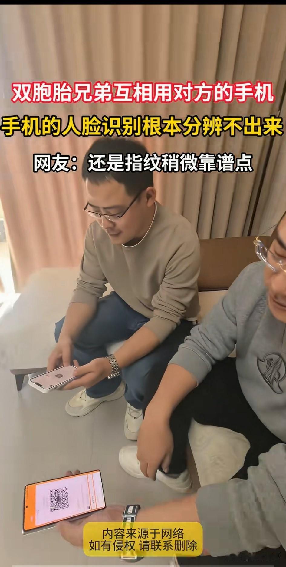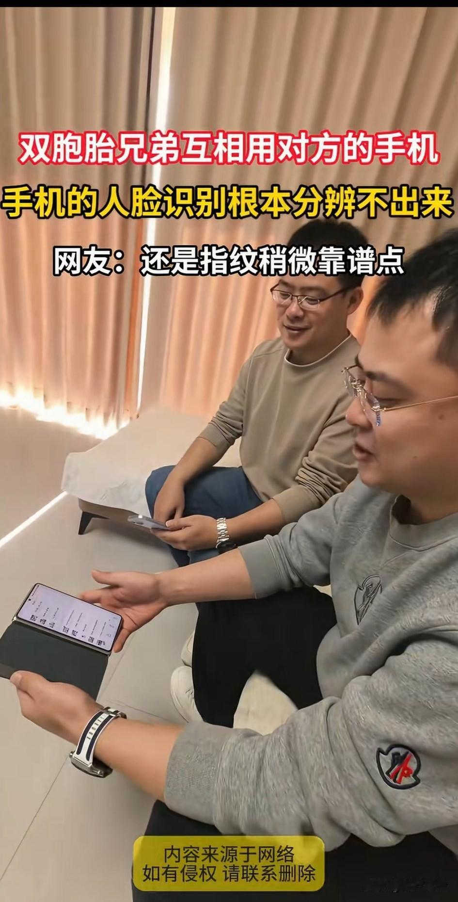 双胞胎兄弟演示两人互开对方手机, 一个人手中拿着华为手机, 一个人手中拿着苹果手机, 两个手机都有,面部开机, 他们想试试双胞胎能不能打开对方的手机,结果一试才知道, 手机根本无法识别两人, 双方都可以打开对方的手机, 随后双方又试了一下面部支付, 支付宝和微信依旧互相付了钱, 看来人工智能也区分不了两个人, 安全严密的支付系统, 在双胞胎面前不堪一击, 网友表示两个人长得太像, 所以数据风险大模型都辨别不出来, 有网友表示还是指纹支付比较靠谱, 就算是双胞胎, 指纹也是不一样的, 还有网友羡慕两个人可以用一个驾照,一个单位上班! 毕竟两个人长得实在太像了, 大家觉得这个实验有趣吗?