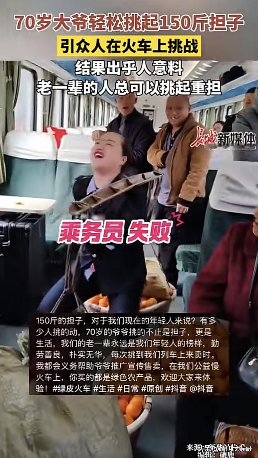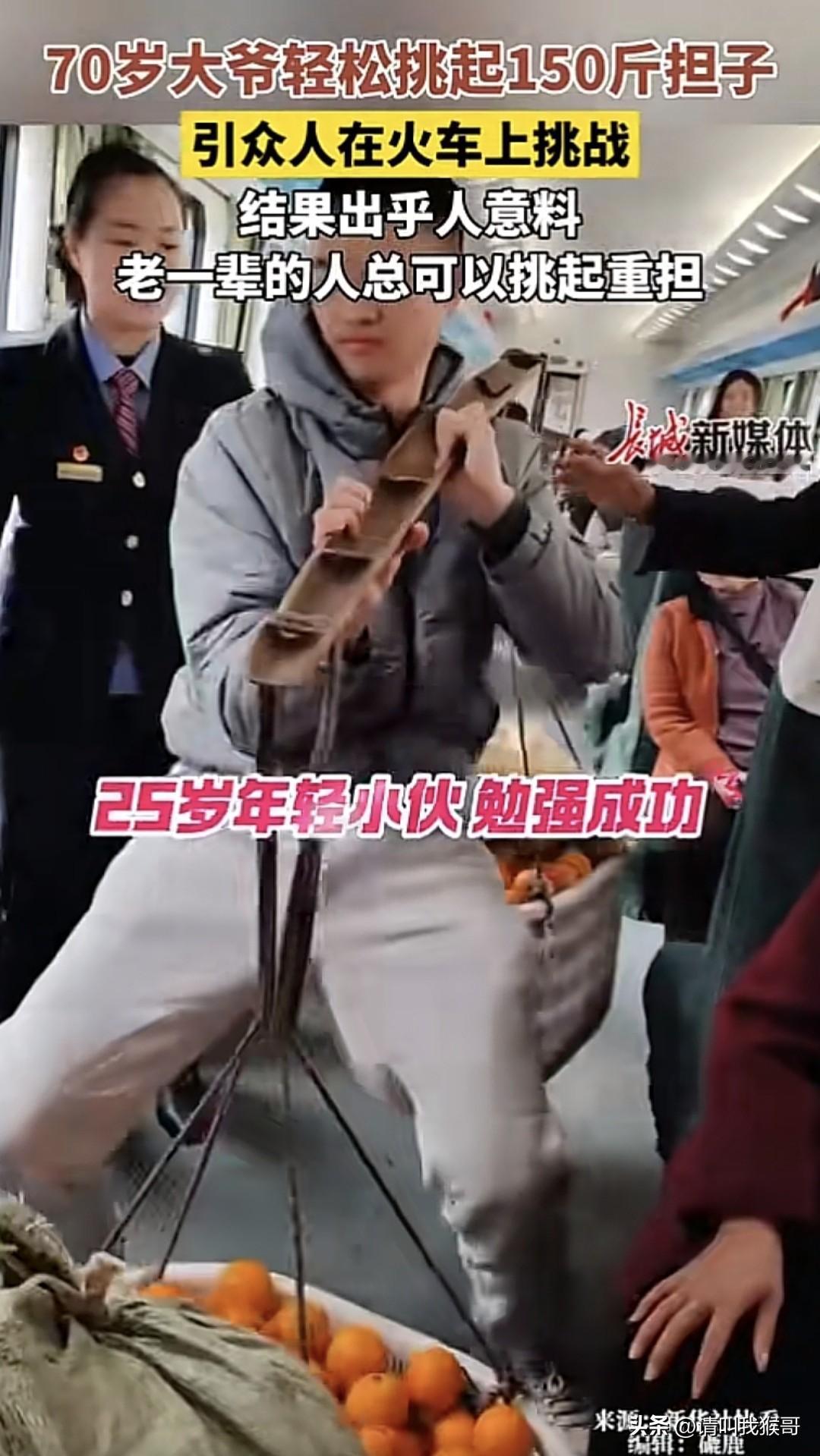 近日途径湖南的一趟普客列车上,大家看到一位70岁的大爷挑着150的橘子乘车,车厢的人突发奇想都来挑战挑担子,最后挑战成功的只有一位四十多岁的农民工大哥,一位农村大姐。女乘务员、大学生还有其他旅客均挑战失败。 据乘务员介绍,这位大爷经常在这趟火车上售卖农产品,乘务员看到了都会义务帮忙宣传,有些旅客会通过挑战挑担子的游戏来决定买不买,于是就出现了上面的一幕。 难怪大家都说“生活的重担”,这种担子还真不是一般人能挑的起来的。