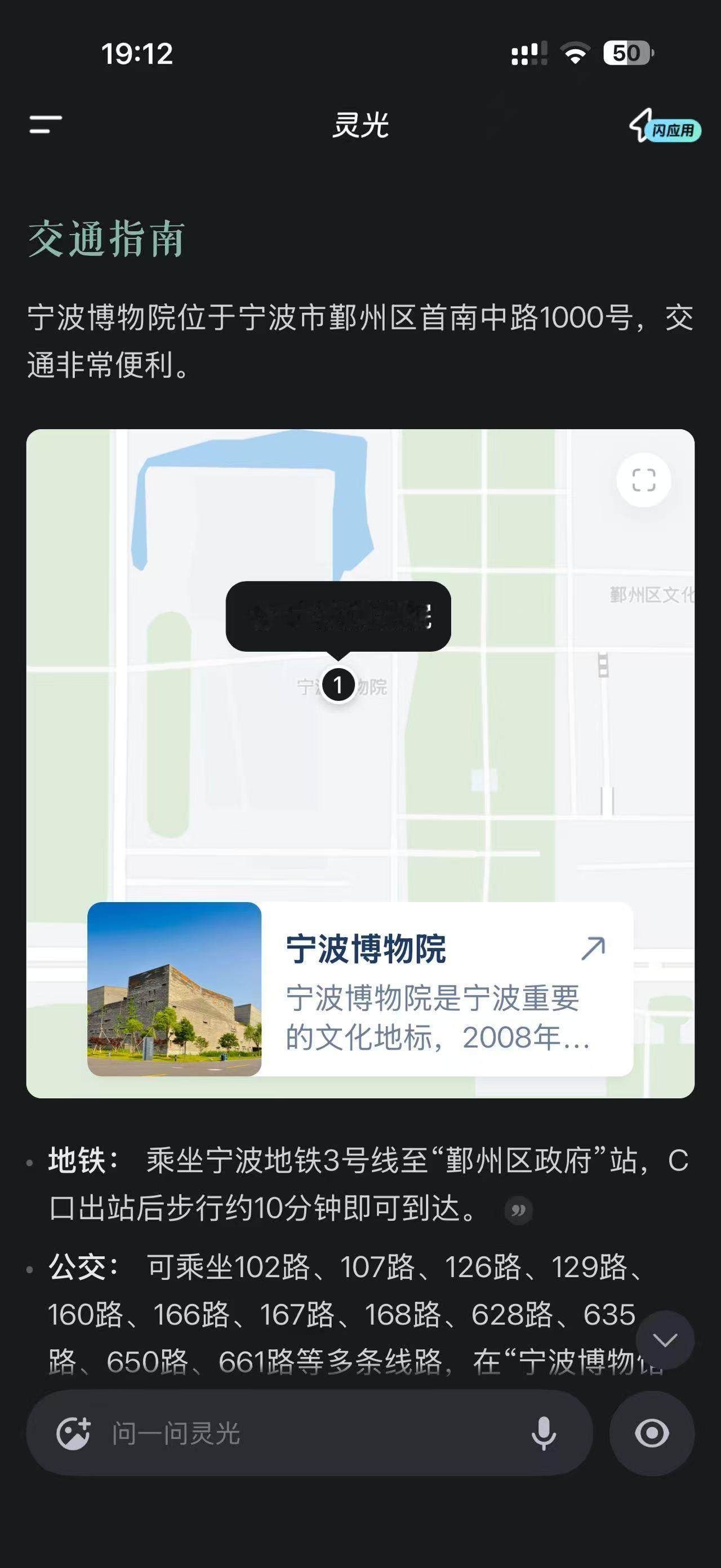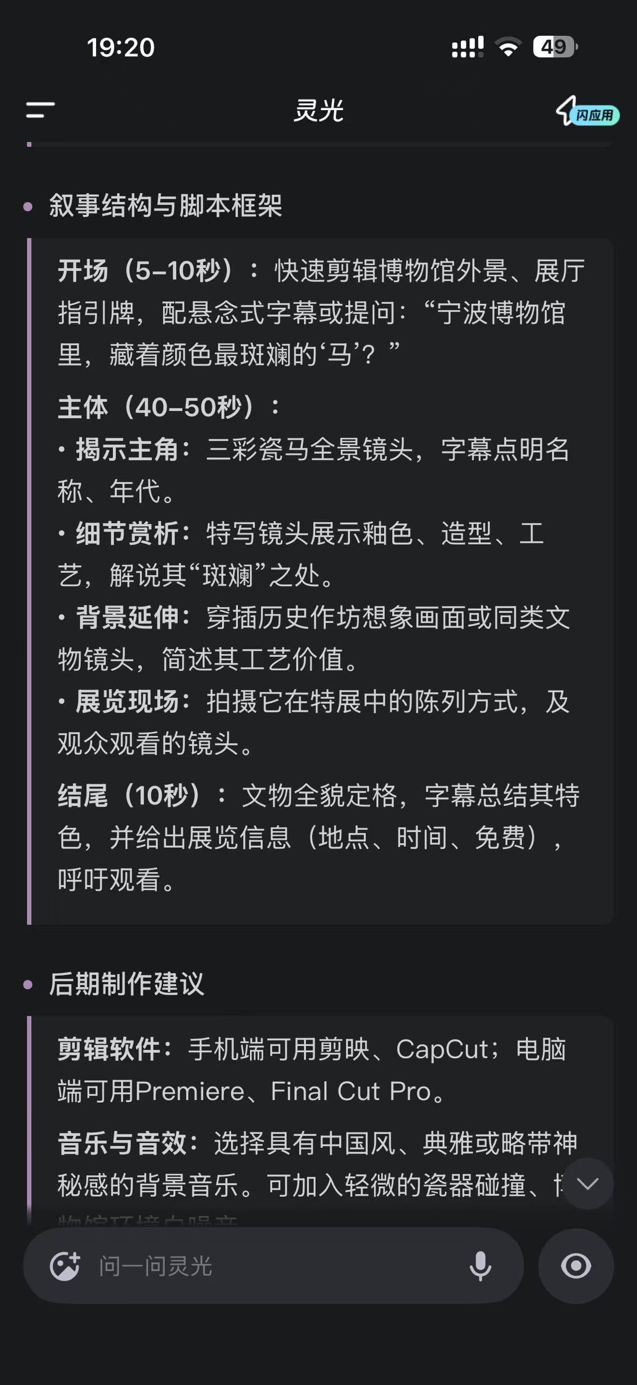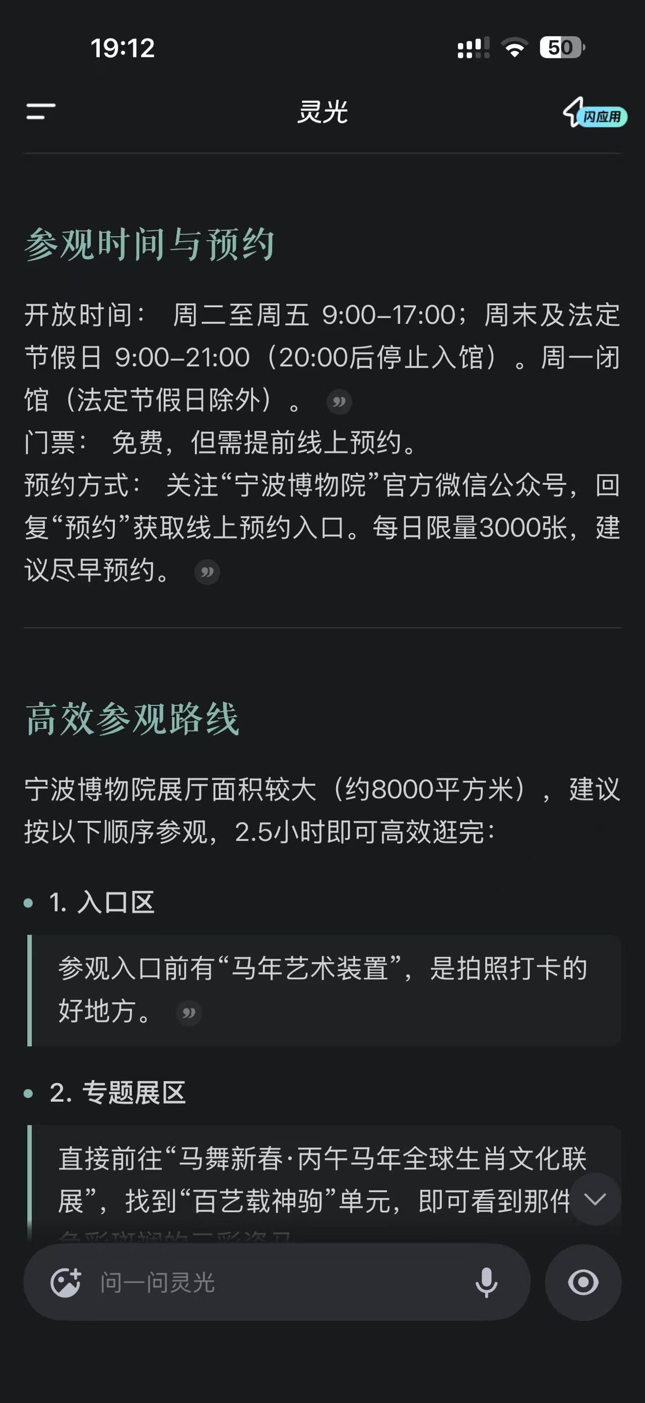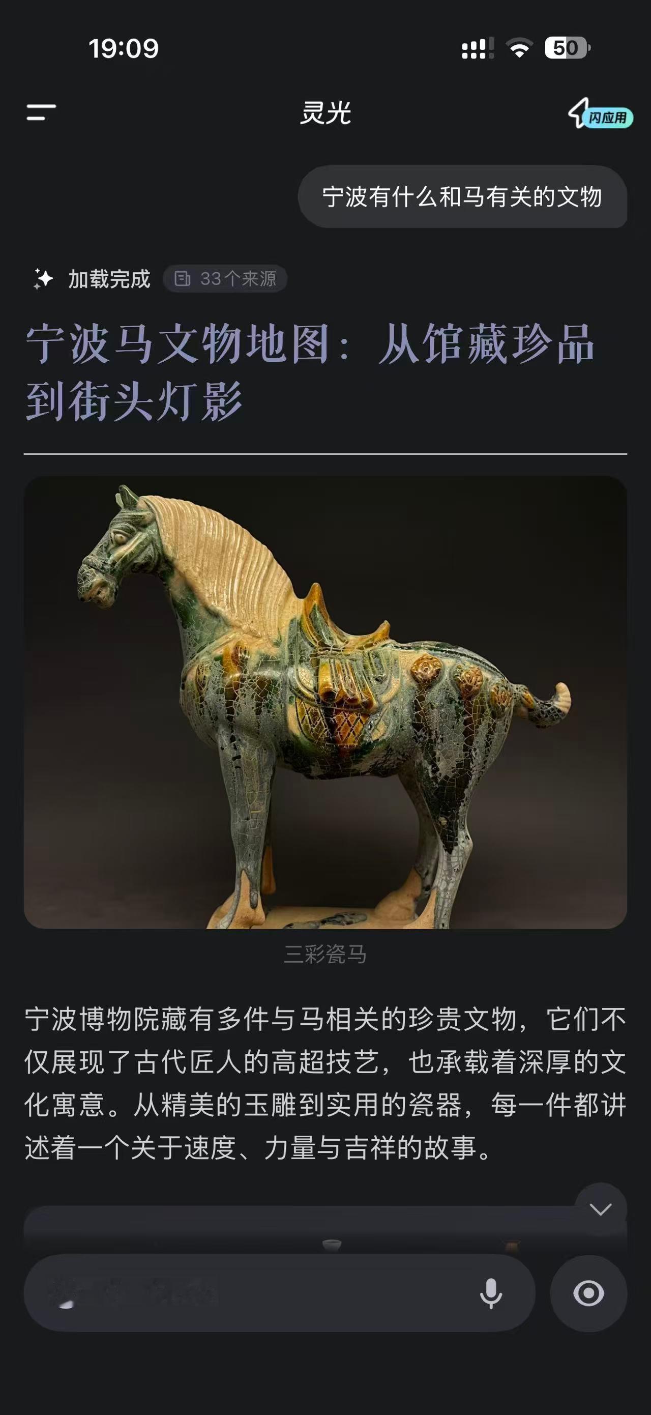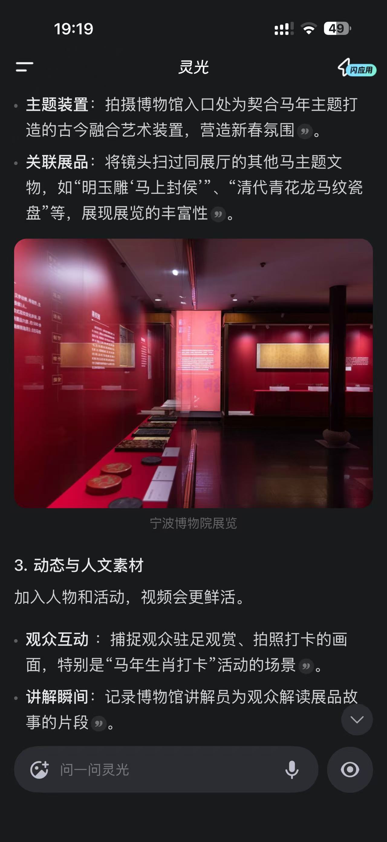 我的马年抓马之旅 好家伙,一个个都不装了,各家AI八仙过海,我用蚂蚁的灵光App让他给我介绍一下宁波和马年有关的文物,结果他不但知道文物信息,还能提供导航等信息,我一看他这回答,赶紧追问了一下能不能给我做VLOG,结果他直接提供了脚本和叙事建议,都是好家伙啊。灵光带你去抓马