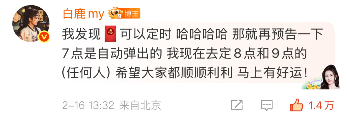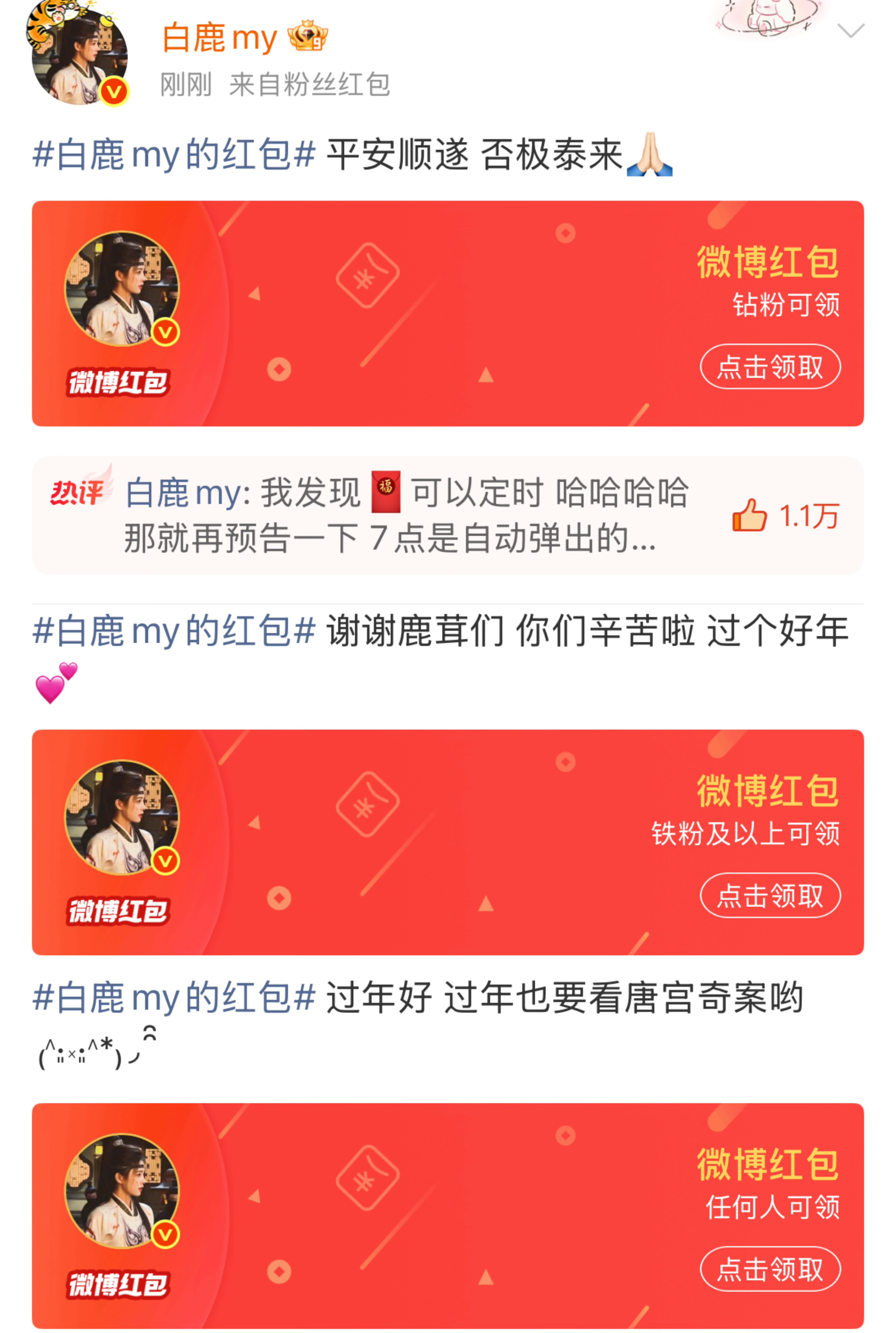 这个白鹿真的太好了🥹今日白鹿就发6个红包 4个是任何人都能领的 2个铁粉和钻粉领的每次都提前预告的鹿儿 特别大方特别大气 今晚还有三个 连白鹿红包封面都是认真剧宣中的 都来看我们👖播出的《唐宫奇案》李佩仪🤗🫶🏻