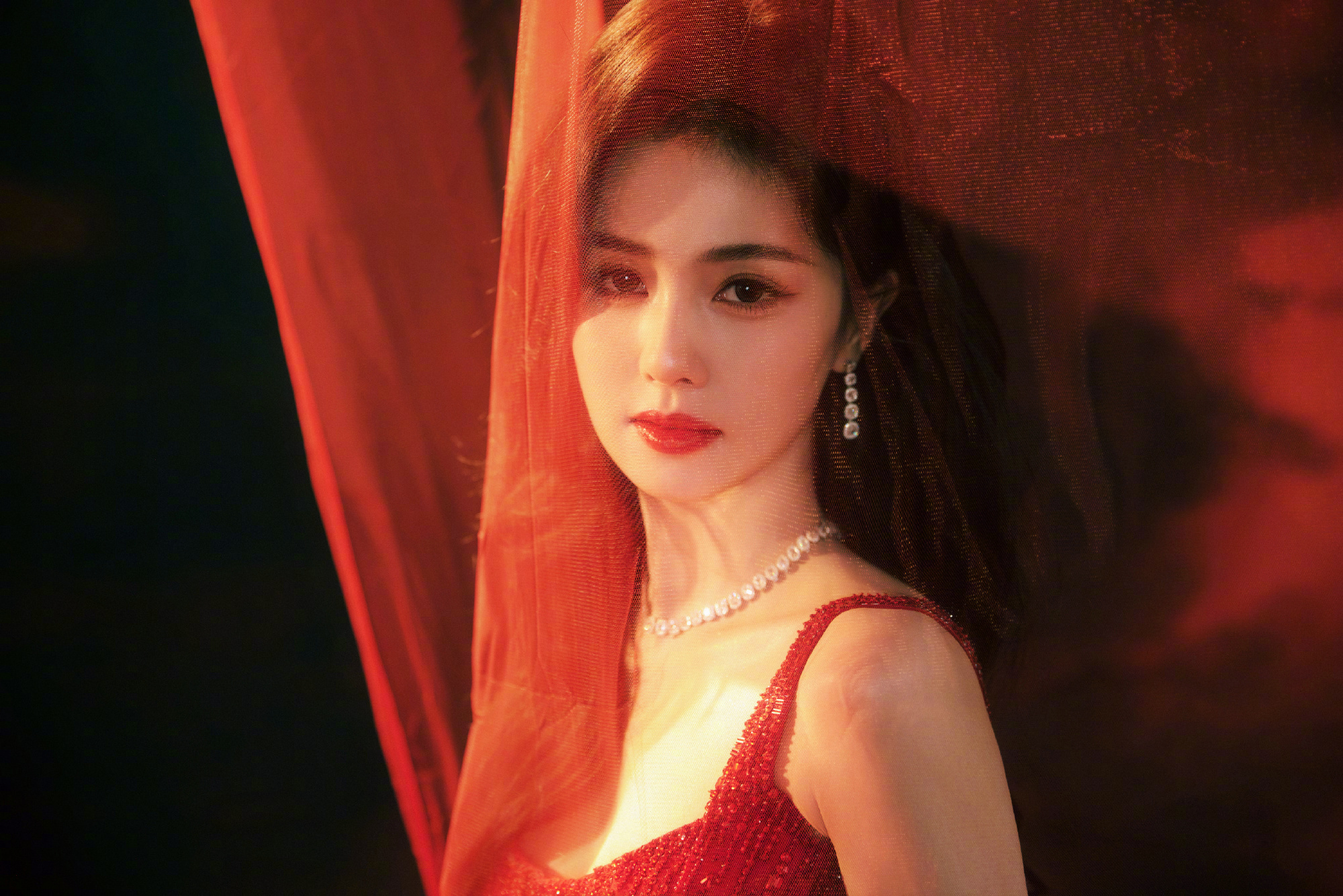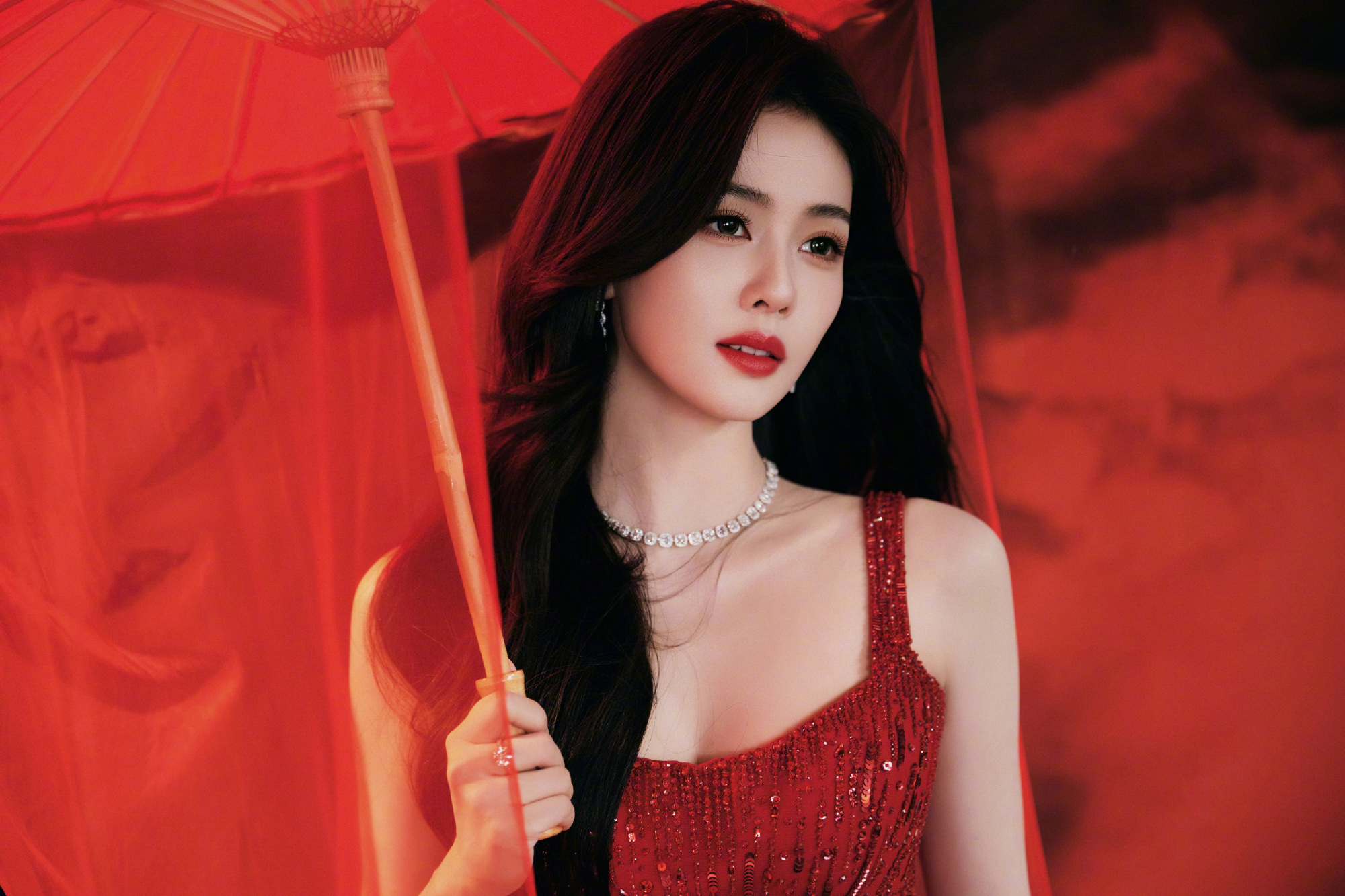 白鹿 新春造型大片,一袭Jenny Packham红色亮片裙,佩戴DeBeers