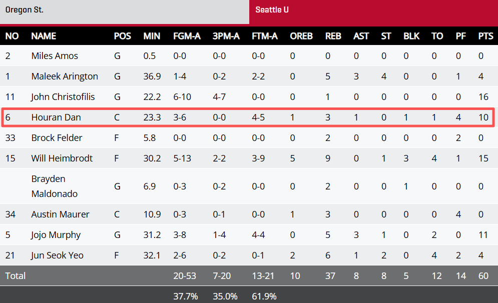本场比赛,西雅图大学前锋淡厚然登场23.3分钟,投篮6中3,贡献10分3板1助1帽。