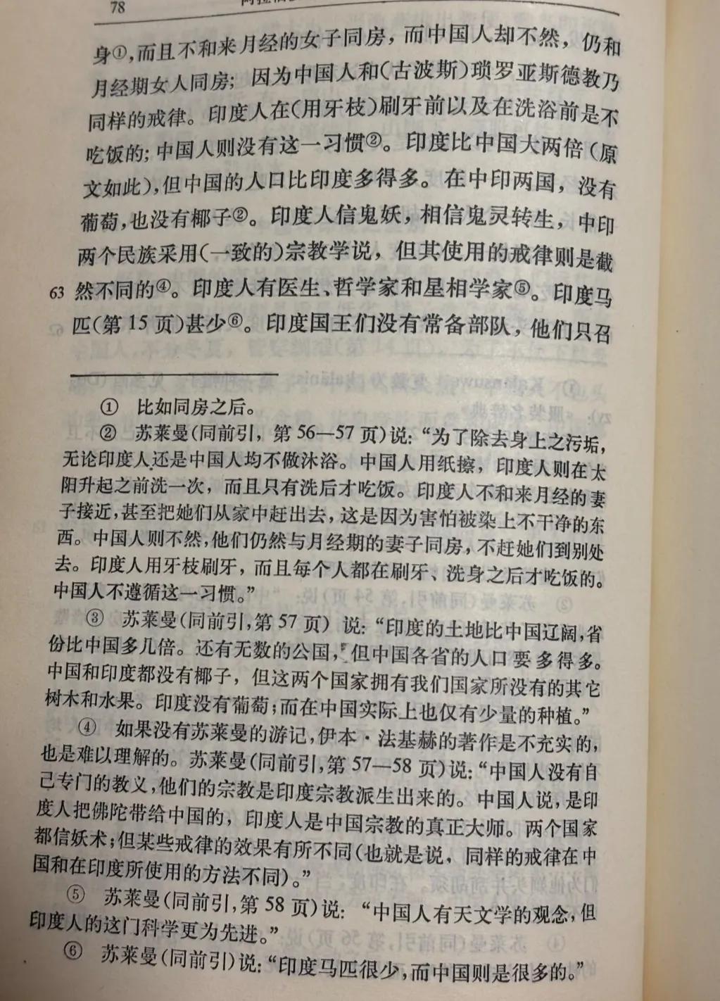 阿拉伯商人苏莱曼九世纪时来到中国游历,写下《中国印度见闻录》,记录了他观察到的当时中国与印度的不同,其中有许多让当代人惊讶的观点,比如中国当时男娼盛行,青年男子充当娼妓的角色;中国人用木头造房子,印度人用石头造房子;中国人会与经期的女子同房,印度人不会;印度比中国大两倍,但中国的人口比印度多得多。