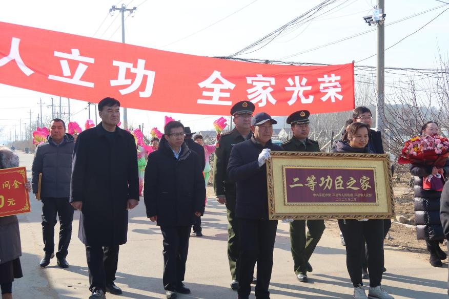 近日,青岛平度市退役军人事务局联合市人武部、解放军某部组成送喜报小组,为荣立二等功的现役军人张卫健、王家栋、刘家宏送上立功喜报和节日祝福。