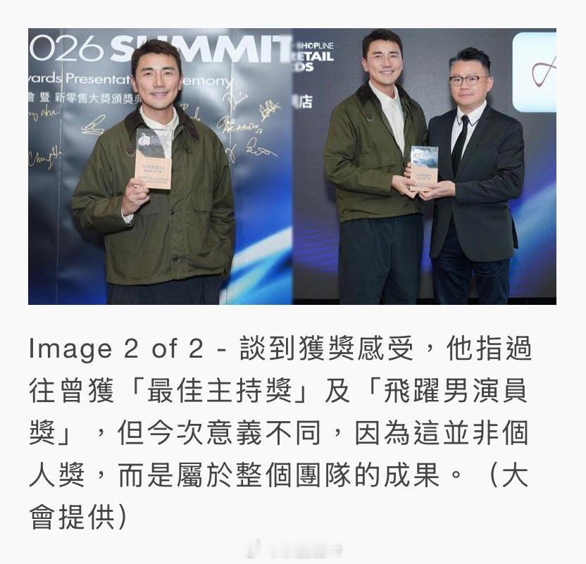 談到獲獎感受,他指過往曾獲「最佳主持獎」及「飛躍男演員獎」,但今次意義不同,因為這並非個人獎,而是屬於整個團隊的成果。