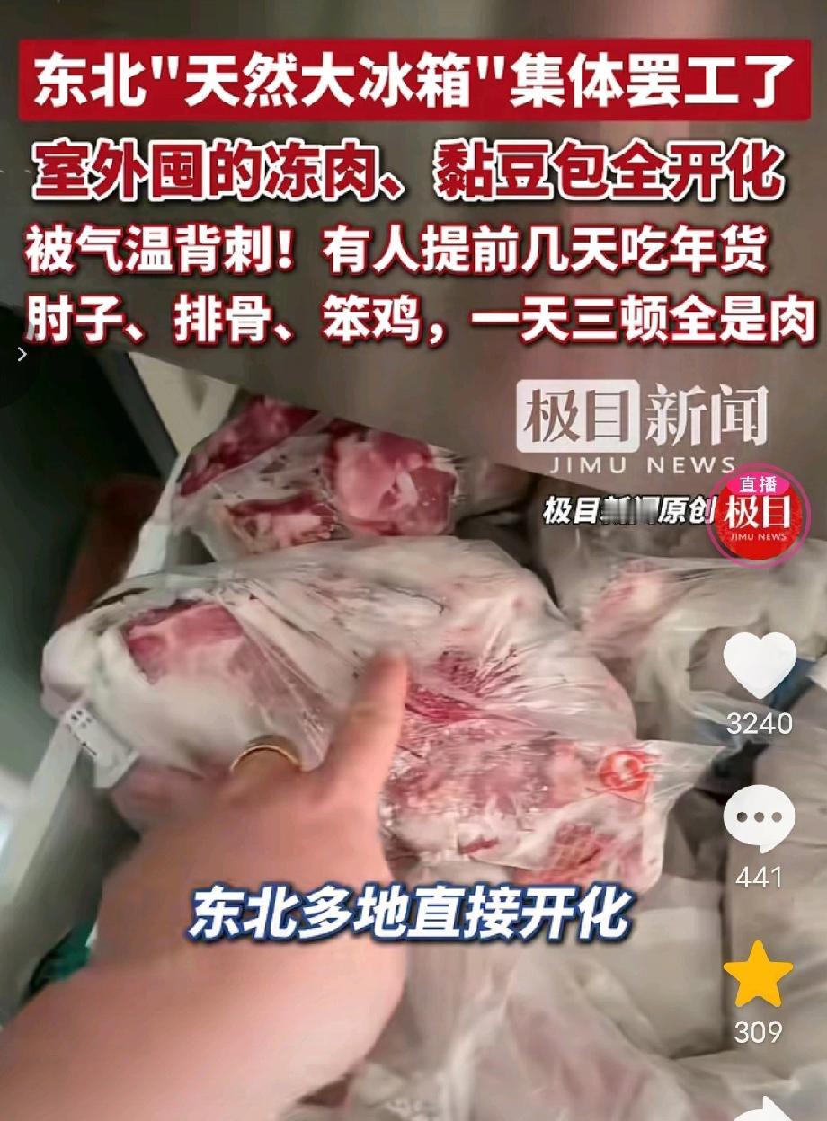 “万万没想到天气!”吉林长春,女子过年在家里囤了几百斤年货,本以为像往年一样直接放在外面的天然大冰箱里就可以,不料,今年过年晚,随着气温升高,放在外面的冻货已经开始淌水,现在一天三顿饭都吃肉,根本吃不完! 据刘女士说,年过年儿女拿回来的肉食占一半以上,大约有几百斤,冰箱根本不够放,只能放在外面,靠室外的天然温度来冷冻保鲜,本想着过年亲戚来了吃,谁知温度一升,肉食就搁不住了,化了再放冰箱复冻就不新鲜了,12号就已经把搁在外面的9袋腌肉拿出来吃了,也算是让孩子的提前享上口福了。 而刘女士家并不是个例,沈阳,长春,大庆网友全都坐不住了,家里的冰箱,冰柜全部塞满,连车的后备箱都塞满了,还是放不下,全家开始了清库存模式,顿顿有肉,吃都吃不完。 看来,这样的储存模式真的要改改了,就算这几百斤肉这天天吃,没个两月也吃不完,再说了,顿顿有肉,人吃了也受不了呀!可这些肉还能搁多久真不好说。 不过,东北的天然大冰箱的确好用,但是,人们还得要考虑次年气温的变化,毕竟囤年货就是为了过年吃,就像今年天气冷的早,暖的早,就要考虑少囤点,吃完了再买,起码吃的都是好的,也避免了不必要的浪费。 对此,大家有什么看法呢?