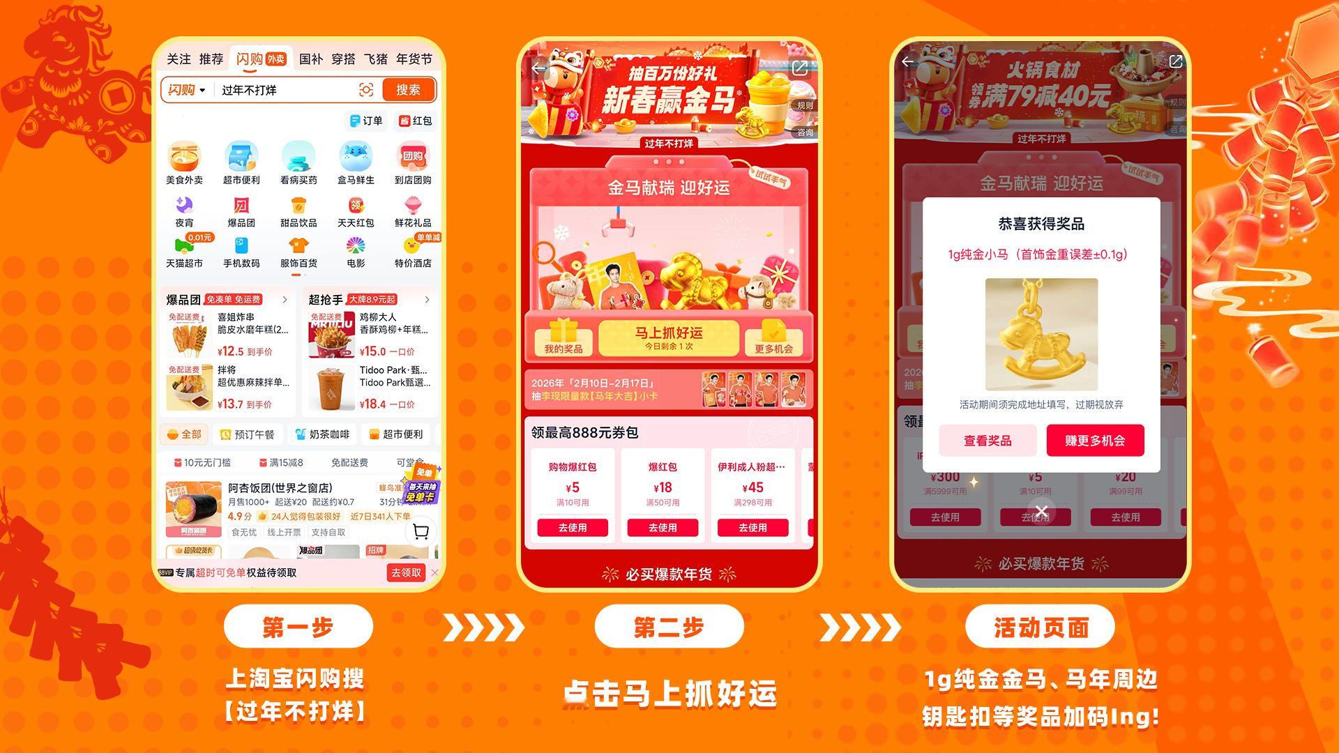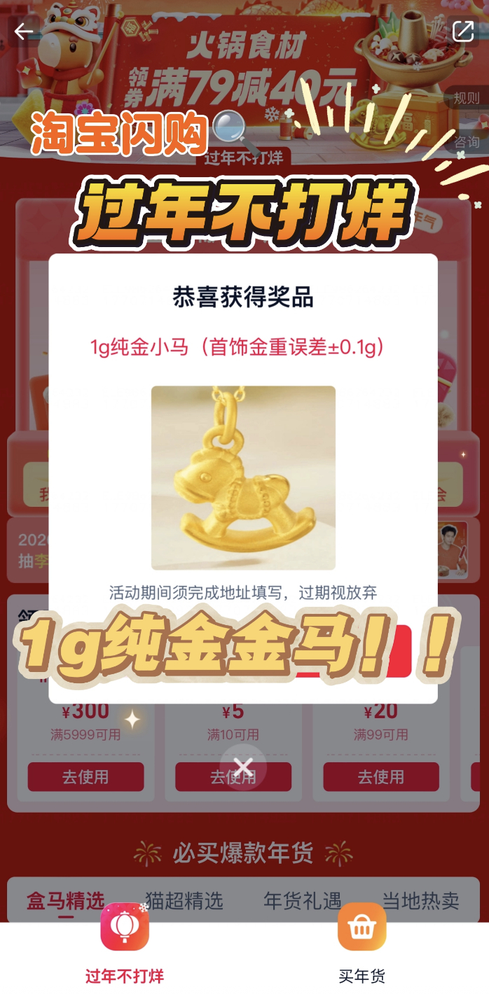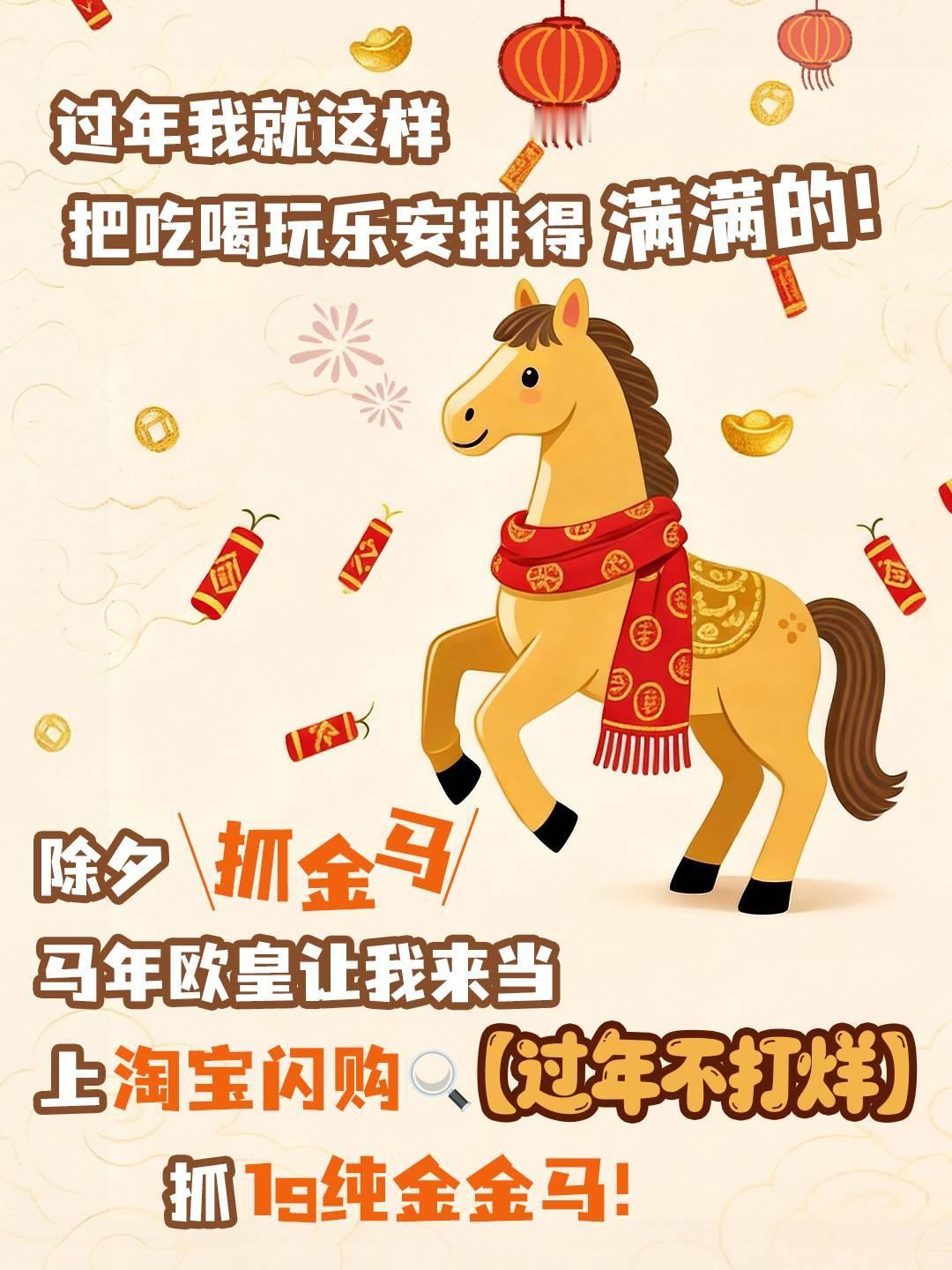 过年上淘宝闪购抓金马赢好运淘宝闪购过年不打烊骏马贺新春电子贺卡先别管了!我发现了更好玩的东西!春节这几天就该喜气洋洋抓金马啊!上淘宝闪购搜【过年不打烊】,抽百万份好礼,赢1g纯金金马,新年好运更快到家~听说还加码了明星小卡和免单卡!妙哉妙哉!