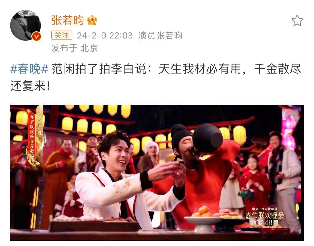 张若昀五登央视春晚 张若昀五登春晚达成!2020年《风雪饺子情》初次亮相,2022年开场魔术拧魔方全网热议,2023年《开饭!开FUN!》吃烧鸡名场面出圈,2024年西安分会场《山河诗长安》“范闲”对诗李白引爆热搜。今年义乌分会场,期待新惊喜!