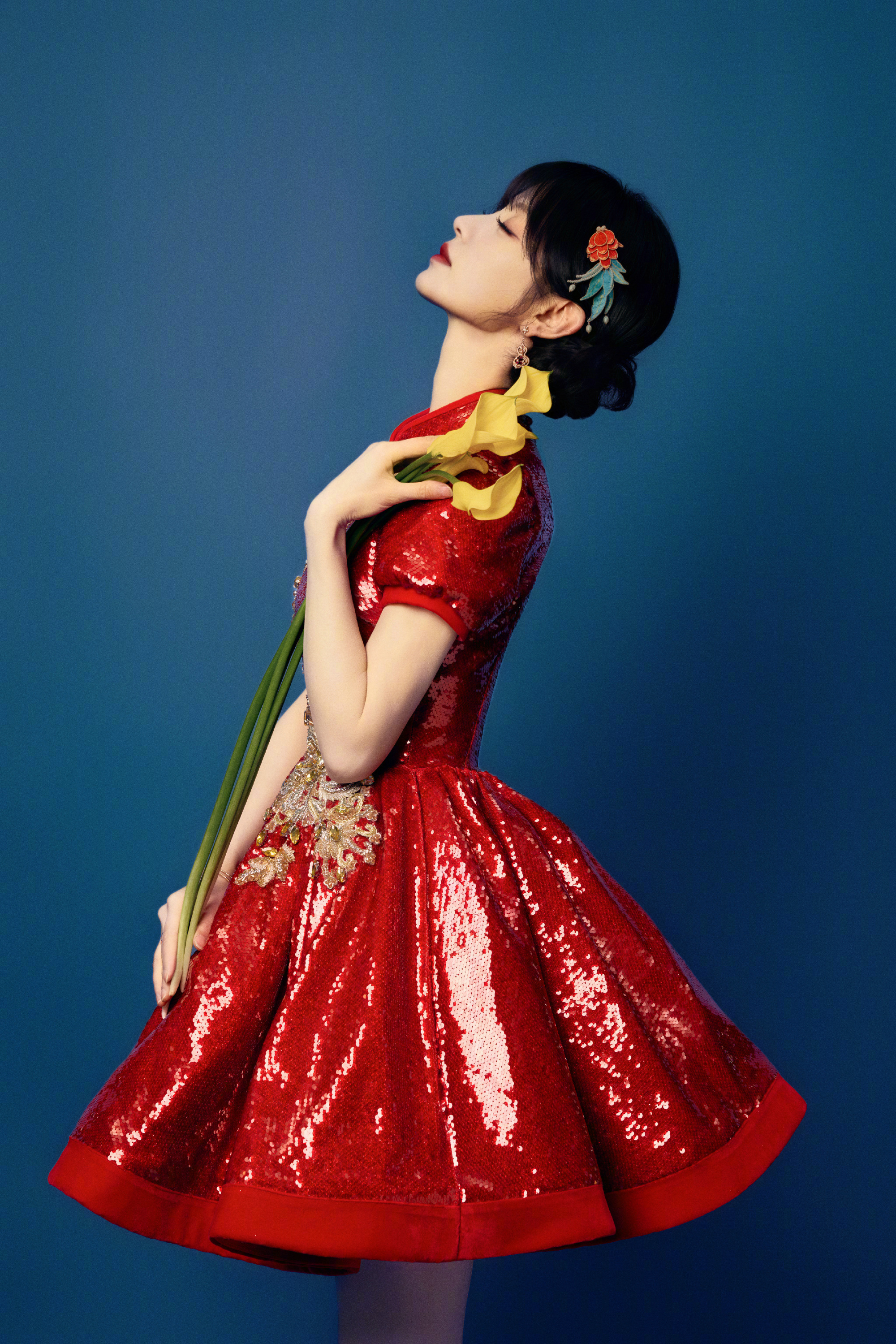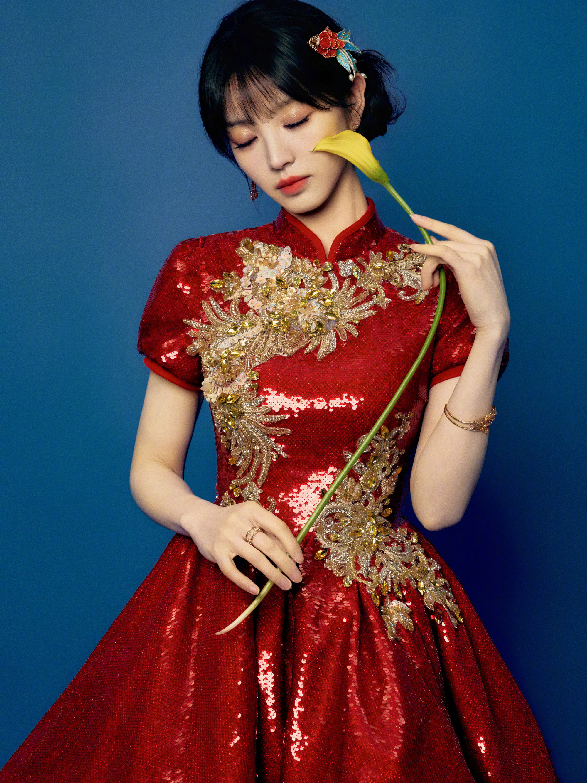 田曦薇 2026年春节联欢晚会造型,红色亮片旗袍式连衣裙,胸前与腰间的金色刺绣与