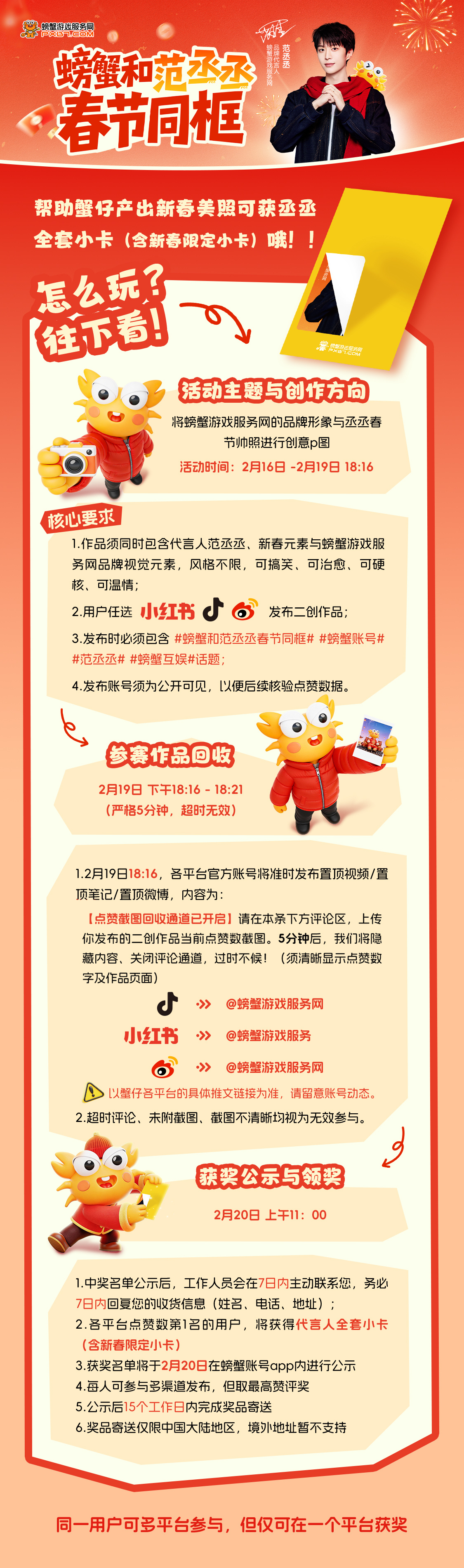 新年接好运,接发财、接桃花,也接和范丞丞一样爆棚的事业运!从年前的三角洲直播,到“钳”手螃蟹账号,到出演春节档电影《飞驰人生3》……丞丞简直就是「丞」功学的典范!做范丞丞的粉丝新年也有好事了!帮螃蟹圆梦春节和范丞丞同框,有机会赢全套春节限定小卡!2月16日-2月19日之间,秀出大家的p图大作收割点赞,然后在2月19日18:16发布在官方指定评论区,18:21截图最高赞的参赛者就能把范丞丞全套春节限定小卡抱回家,p图大师们快做好准备,全套小卡在向你们招手!螃蟹和范丞丞春节同框 螃蟹账号 范丞丞 螃蟹互娱