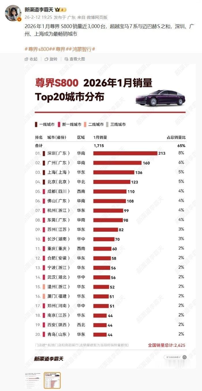 博主 新渠道李霸天 透露数据:2026 年 1 月,鸿蒙智行尊界 S800 销量近 3000 台(2625 台),超越宝马 7 系(第二名)与迈巴赫 S 级(第三名)之和,深圳、广州、上海成为最畅销城市。图片显示,尊界 S800 依旧位居大型豪华轿车销量 TOP1。