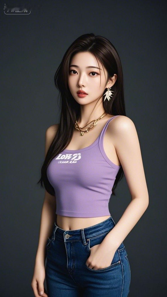 这个女生穿着紫色背心和牛仔裤,搭配金项链,看起来非常时尚。