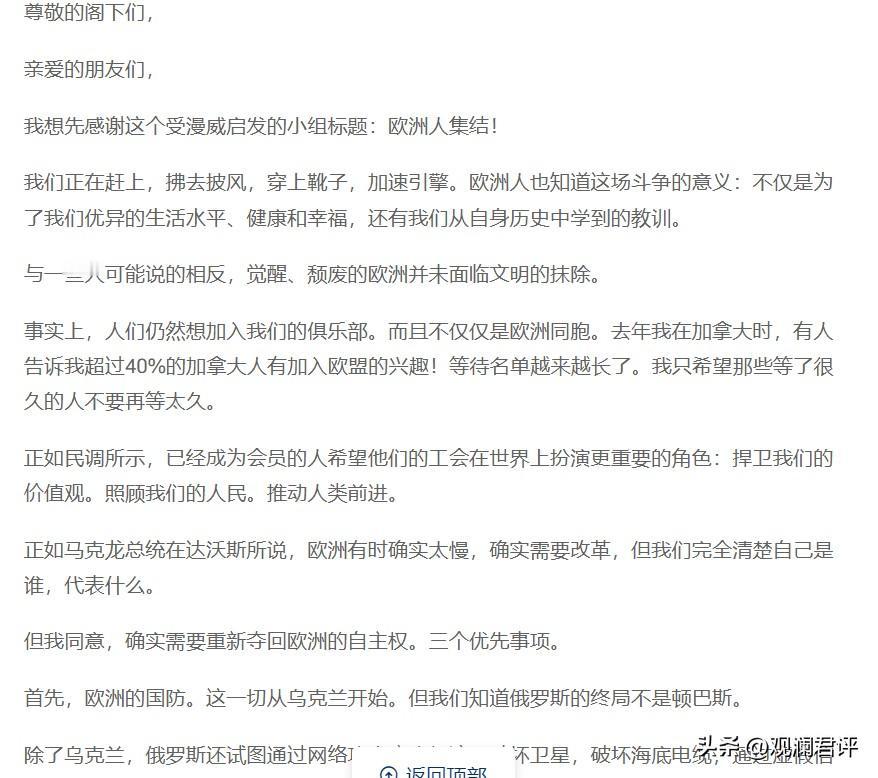 欧盟外交代表卡娅·卡拉斯在慕尼黑安全会议上讲话的最大新意是欧盟要扩张,扩的不光是东欧和南欧国家,而且会扩到欧洲以外,最有可能的就是加拿大。 欧盟正在从区域性组织转变为全球性组织,北约也明显表现出这种趋势。