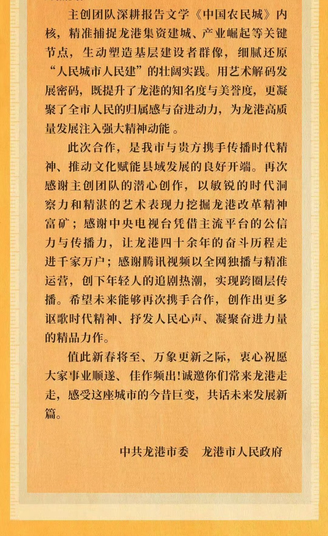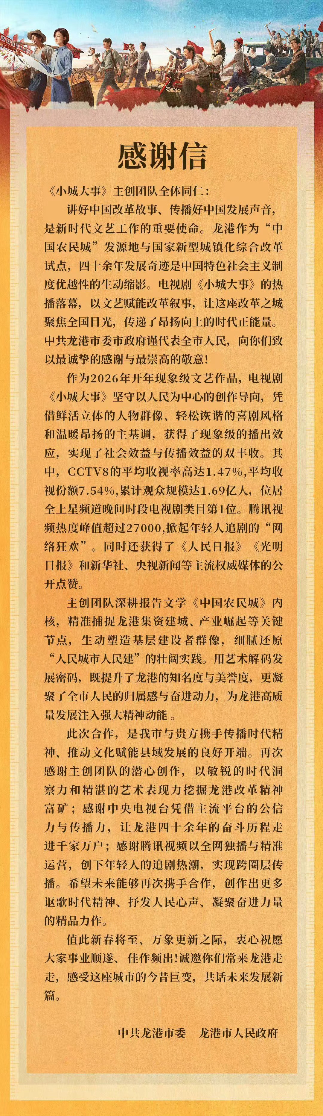 除夕龙港给赵丽颖《小城大事》剧组发了感谢信。好用心的礼物,小城大事新年快乐!李秋萍镇长新年快乐!!小城大事