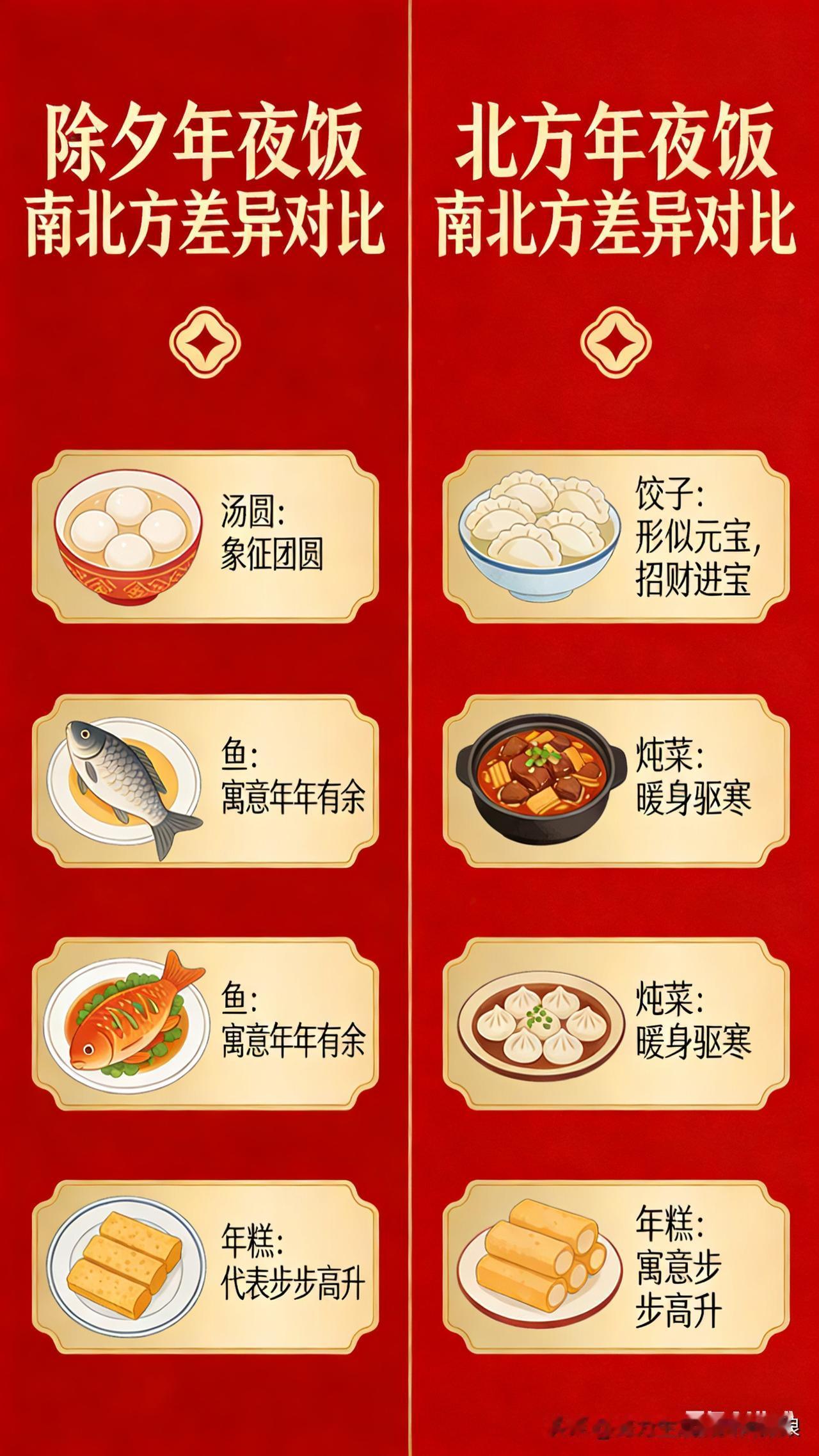 我的今日状态:😁轻松愉快 我这里的天气:🌧下雨 南北方除夕年夜饭,有什么不同呢,核心差异在主食、菜品、口味、仪式,一眼看懂👇 一、主食:饺子 vs 年糕/汤圆/米饭 北方:饺子是灵魂 必吃,形似元宝,招财进宝;全家围包,更岁交子 常包硬币/糖,吃到者来年好运 华北/东北:饺子+米饭/馒头;西北/中原:饺子+面条/馍 南方:无统一主食,米饭打底 江浙沪/福建/两广:年糕(年高,步步高升) 上海/苏州/安徽:汤圆收尾(团团圆圆) 广东/广西:白米饭+萝卜糕/芋头糕/粽子 湖南/江西:咸年糕+米饭 二、菜品风格:豪爽实在 vs 精致意头 北方:大盘大碗、量足管饱、硬菜当家 经典:小鸡炖蘑菇、酱肘子、锅包肉、炸丸子、杀猪菜、皮冻、地三鲜、糖醋鲤鱼 数量:8/10道双数,寓意富足 海鲜少,多猪牛羊鸡,炖/烧/炸为主 南方:小盘精致、种类多、海鲜多、重寓意 经典:白切鸡(大吉)、清蒸鱼(年年有余,必剩)、腊味合蒸、梅菜扣肉、佛跳墙/盆菜、八宝饭、生菜(生财) 数量:十几到二三十道,摆满桌 海鲜占半,蒸/炒/白灼,保留本味 三、口味与汤品:厚重 vs 清鲜 北方:重油重盐、酱香浓郁、偏咸香 汤:可有可无,多为简单鸡汤/排骨汤,解腻用 南方:清淡鲜甜、讲究本味、偏甜/鲜 汤:必不可少,老火靓汤/腌笃鲜/佛跳墙,提前炖,开席先上 四、仪式与收尾 北方:饺子是压轴仪式,吃完才算过年 南方:多以汤/汤圆/八宝饭收尾,寓意圆满 一句话总结 北方:饺子当家,炖菜管饱,豪爽实在 南方:米饭打底,海鲜精致,意头满满 北方吃饺子 北方年夜饭 南北方年夜饭 南方年夜饭 年夜饭南北差异 南北方年俗差异 中国各地年夜饭 图片由AI生成