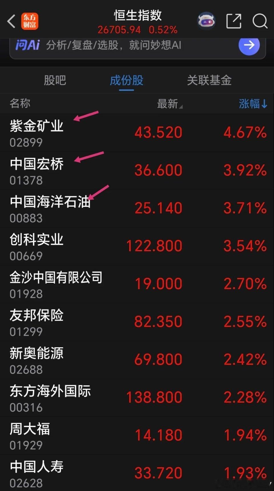 恒生科技大年三十勉强收红,够意思了,没有学癌股绿盘报收给过年罩阴影,关键是年后两天走势,会影响A股节后开市。 港股今天黄金及有色铝以及创新药涨幅居前。 A股市场年终收盘大跌眼镜,过节也不让人安心。 A50期指目前上涨,是个好兆头。 国际黄金目前下跌1%,波动不太大,密切关注后面走势,只要假期黄金白银不大跌,A股市场及有色金属板块开门就能稳住。好股市有风险,投资需谨慎!