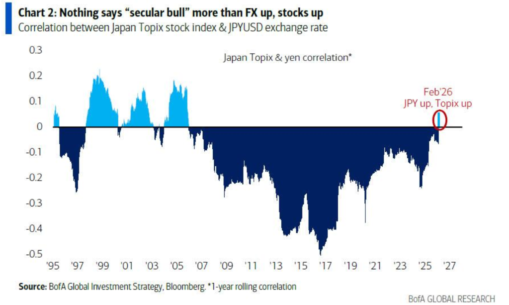 日元与日经指数的相关性,自2005年以来首次转为正值。