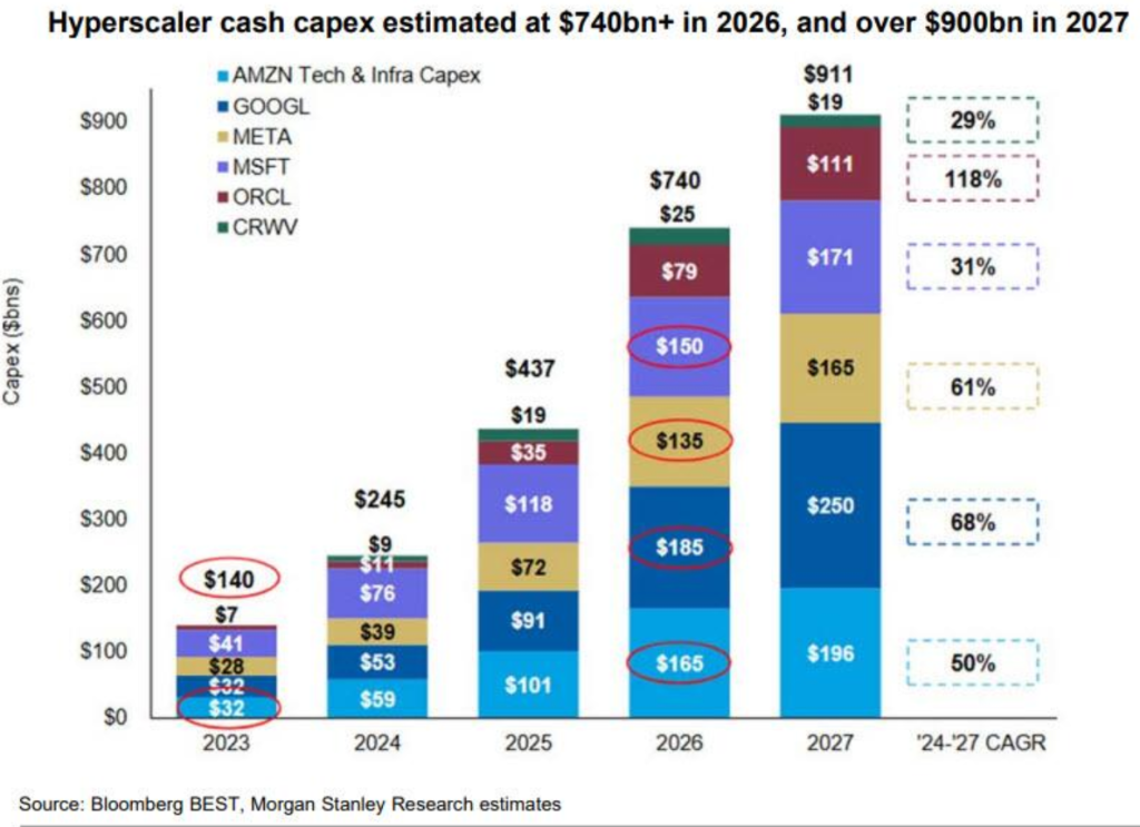 三天前市场还在消化6700亿美元的支出预期,而这次Hartnett指出,2026年超大规模云厂商(Hyperscalers)的资本支出预期已飙升至7400亿美元。这一天文数字不仅是惊人的,更是危险的。