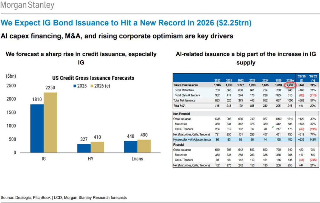 为了维持这种规模的资本开支,科技巨头们可能被迫开启大规模的债券发行狂潮。这意味着,曾经拥有完美资产负债表的科技成长股,正在全面"信用化"。