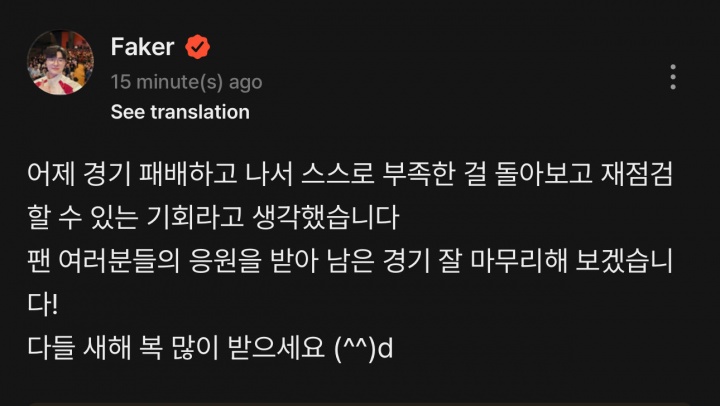 直播吧2月16日讯在昨日的LCK杯季后赛上,T1以1-3的比分不敌BFX掉落至败者组中,今日Faker在社交媒体上发文自省:昨天比赛失利后,我认为这是自我反思、重新审视不足并进行检讨的机会。我会在各位粉丝的支持下,好好完成剩下的比赛!大家新年快乐,福气多多哦!