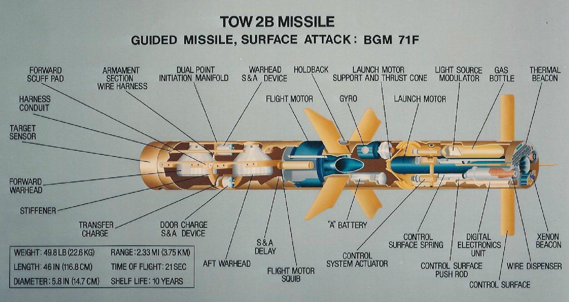 陶2B反坦克导弹采用掠飞攻顶,战斗部内包含2个钽制EFP战斗部,当导弹飞跃坦克时,自锻破片攻击坦克防护比较薄弱的顶部装甲。