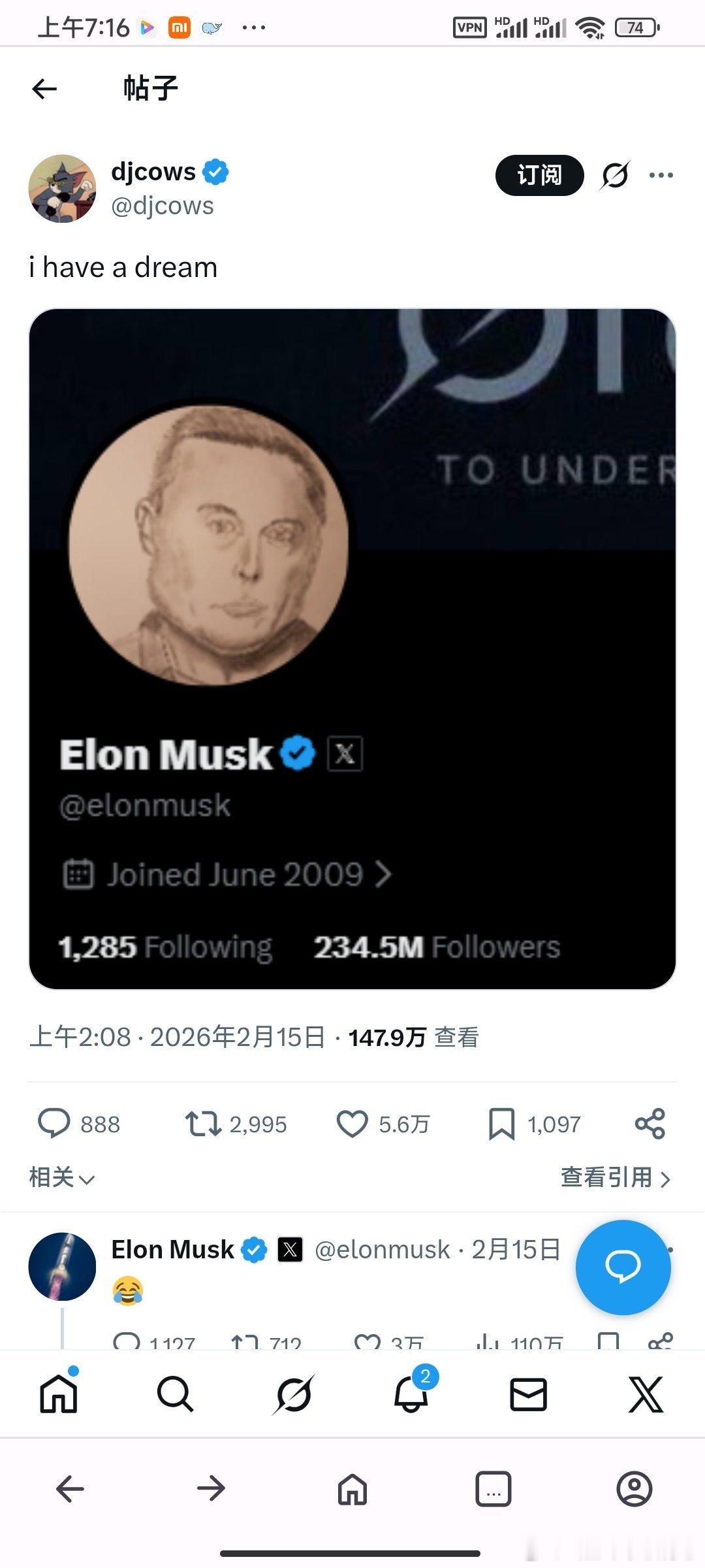 随后他展示了马斯克拉黑他的截图,流量继续暴涨。