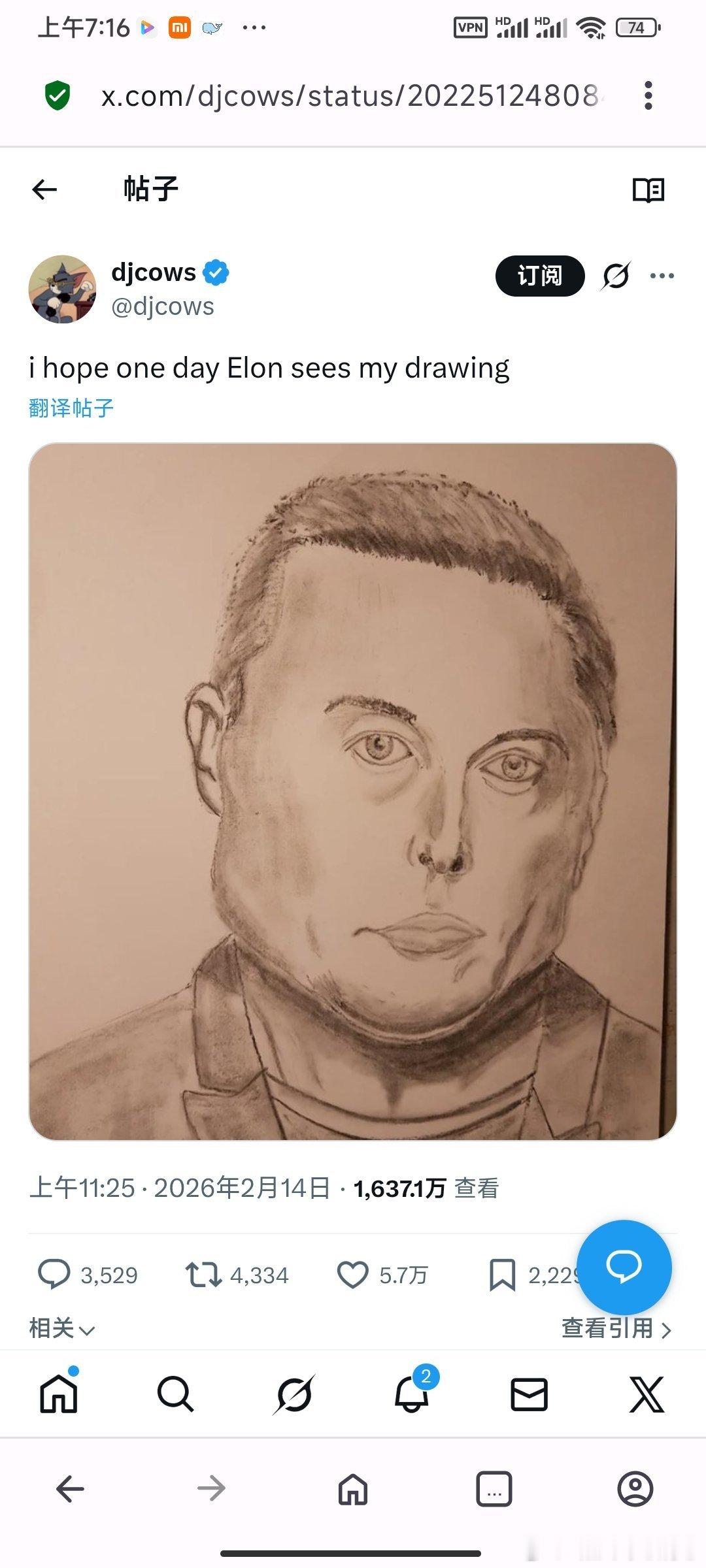 一哥们在推特上爆红的原因,是他给马斯克画了一幅传神的肖像,流量暴涨。