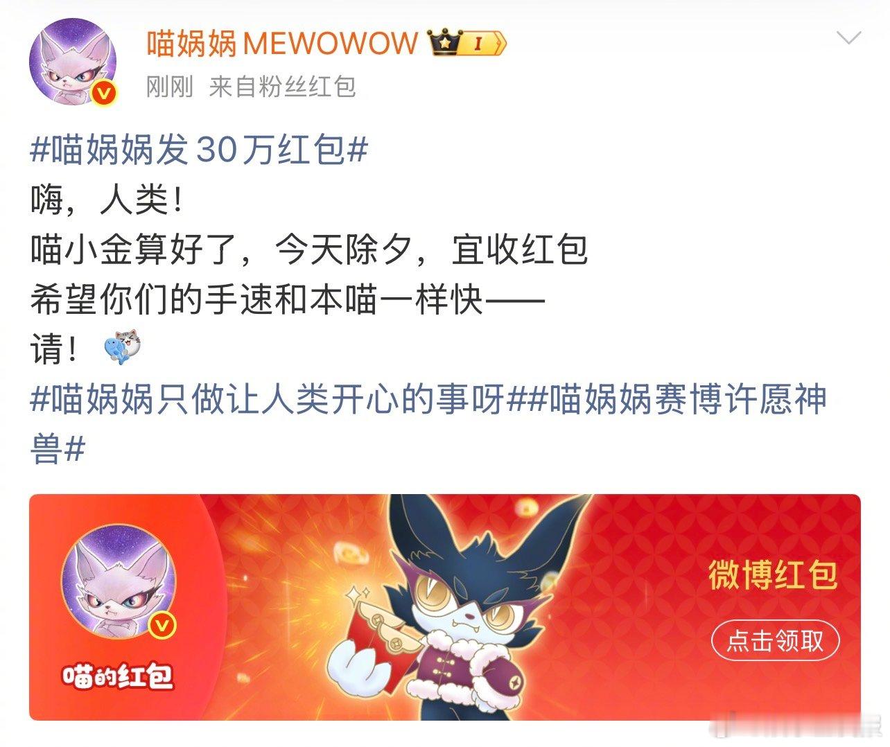 喵娲娲发30万红包 除夕快乐!喵娲娲带着30万红包来啦,就看谁的手速能跟上本喵的