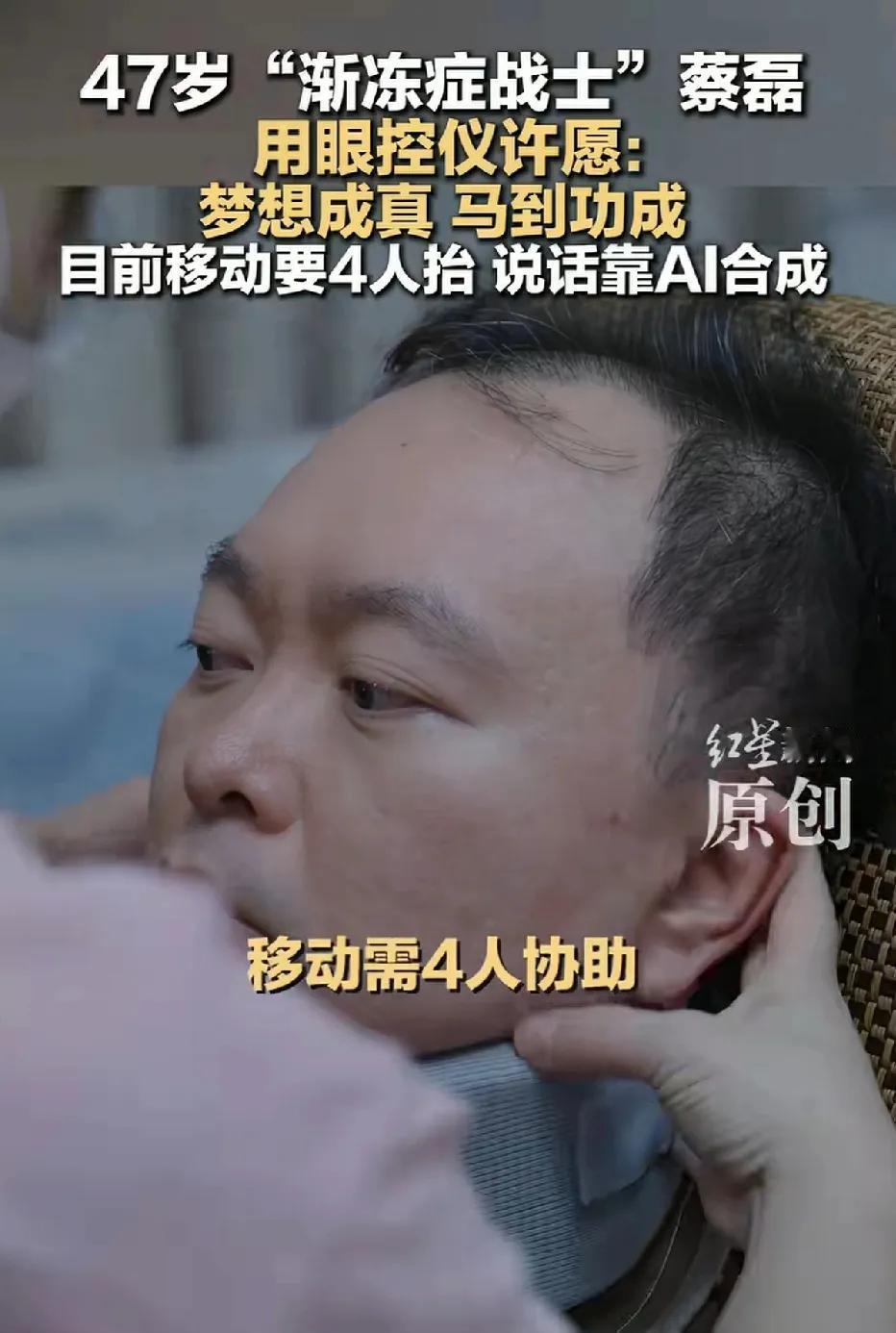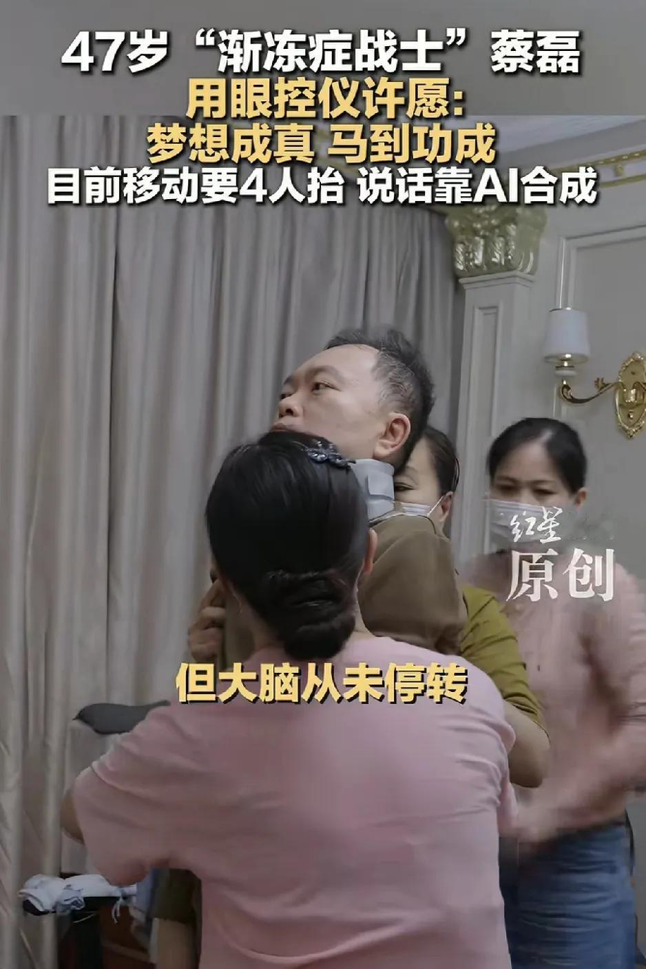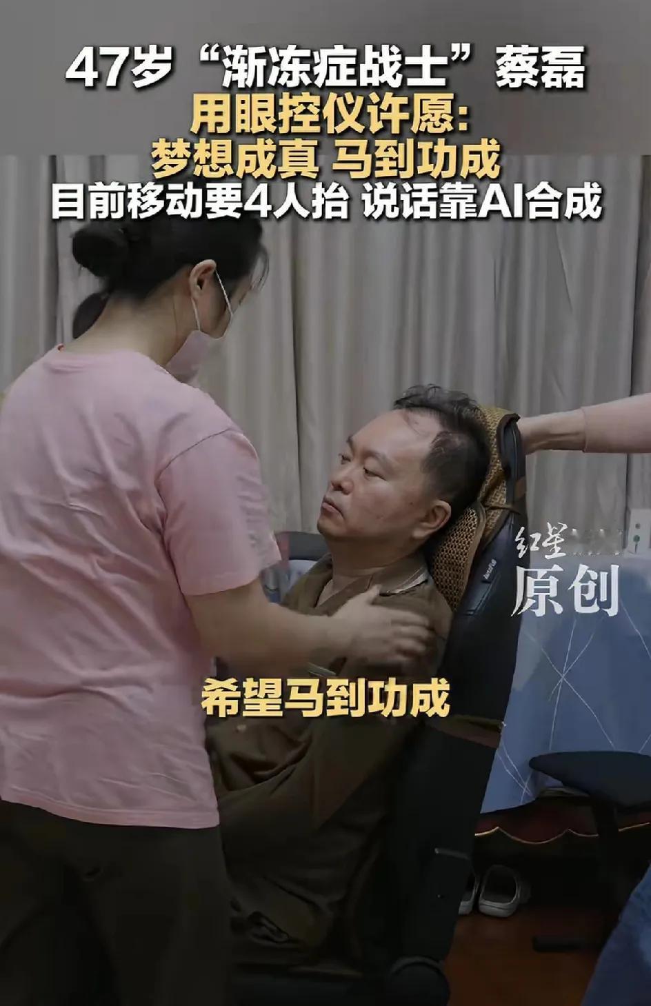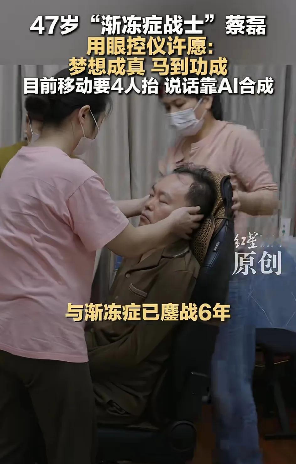 四十七岁的“渐冻症战士”蔡磊一直在战斗。他的新年用眼控发出祝福,梦想成真,马到成功!他说自己正逼近疾病的终点,但一定会迎来最精彩的结局。他现在需要四人帮助移动,夜间需要每小时翻身缓解疼痛,但他的大脑从未停转。他现在讲话都要需要 AI合成,他已经与渐冻症激烈的鏖战了6年。他是一位值得令人佩服的勇士。