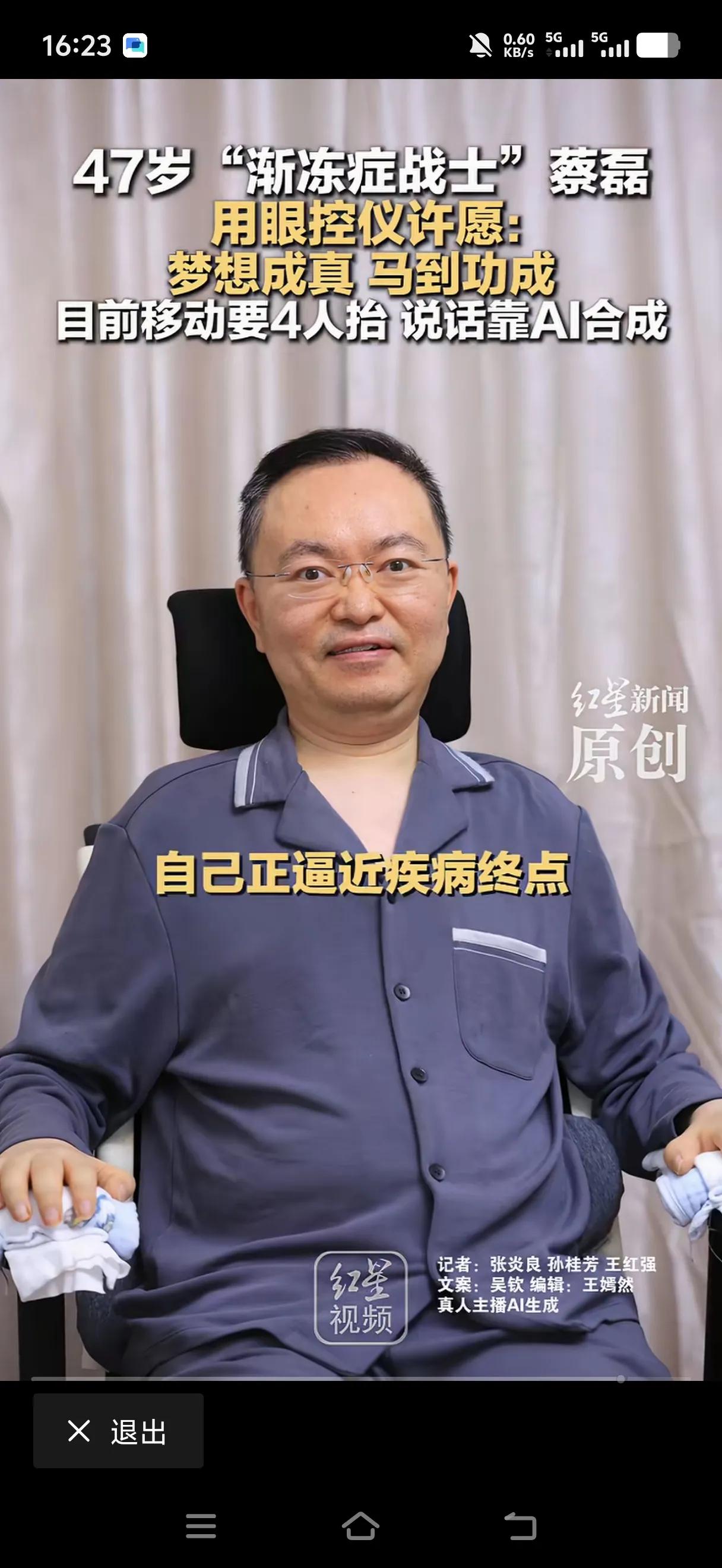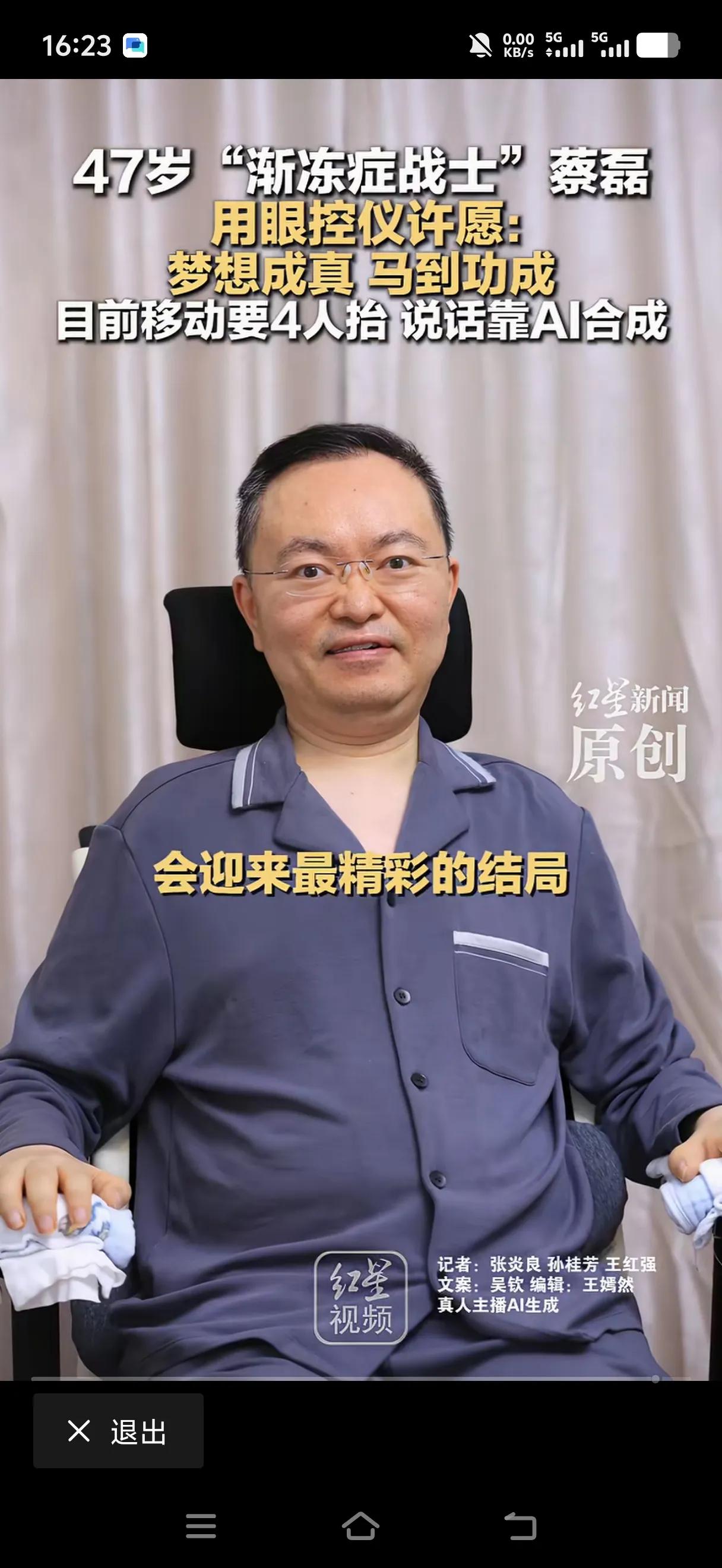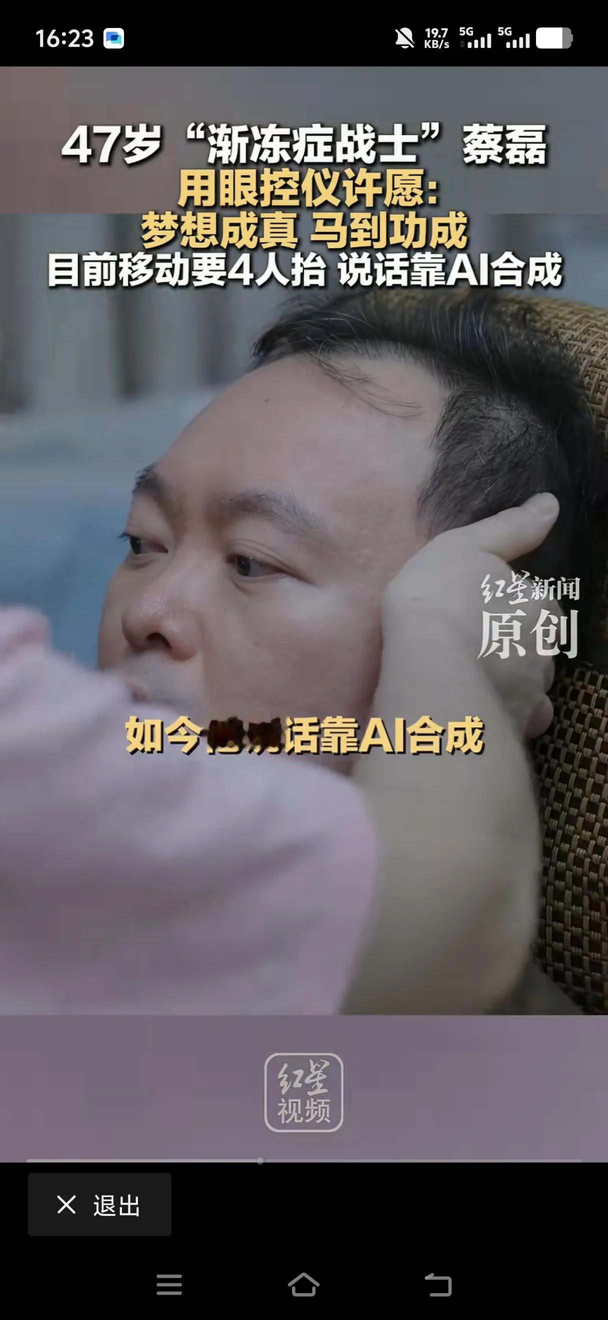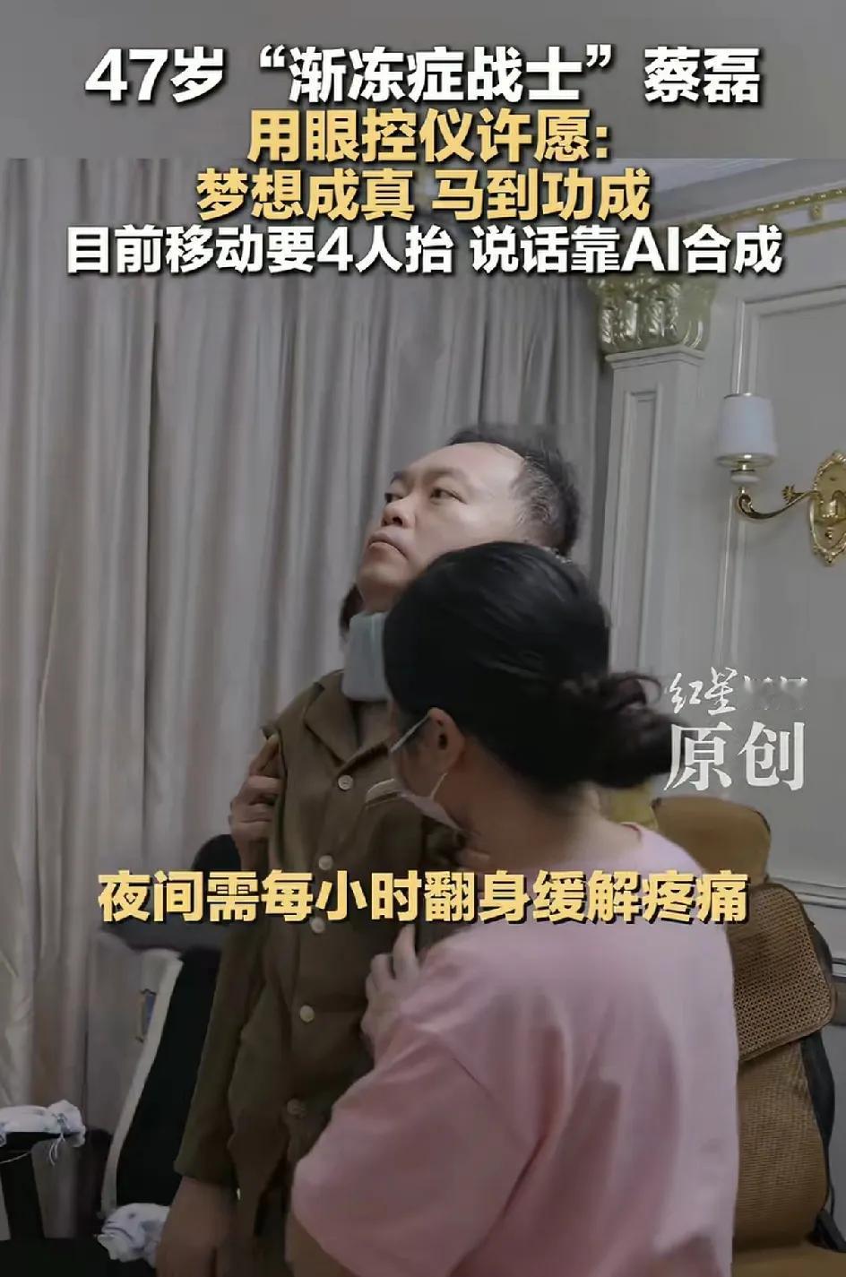 四十七岁的“渐冻症战士”蔡磊一直在战斗。他的新年用眼控发出祝福,梦想成真,马到成功!他说自己正逼近疾病的终点,但一定会迎来最精彩的结局。他现在需要四人帮助移动,夜间需要每小时翻身缓解疼痛,但他的大脑从未停转。他现在讲话都要需要 AI合成,他已经与渐冻症激烈的鏖战了6年。他是一位值得令人佩服的勇士。