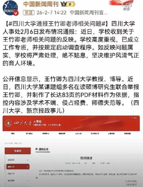 川大博导王竹卿真是丧心病狂!拿着国家千万科研经费,揣着日本永居权,干的全是缺德事!多名硕博生憋不住,爆83页PDF实锤举报。 王竹卿拥有15年日本留学和工作经历,于2021年回国入职四川大学机械工程学院,成为特聘研究员和博士生导师。举报材料披露,他及其家人早已获得日本永久居留权。 凭借海外经历和学术光环,王竹卿回国后迅速获得了包括“四川省天府峨眉计划创新领军人才”在内的多项头衔,并承担了国家重点科研项目,累计获取的科研经费高达千万元级别。 然而,这些本应用于科技创新的资金,据举报已被他当作私人钱包。学生们提供的证据表明,王竹卿通过其私人公司进行资金转移,挪用科研经费偿还个人房贷、支付女儿高额补课费及家庭日常开销。在承办国际会议(JCK 2024)时,他先要求学生将六万多元注册费打入其私人公司账户,继而用科研经费报销,空手套白狼。他还虚列学生工资,进行偷税漏税。 在学术方面,王竹卿被指长期胁迫学生篡改实验数据、伪造研究流程,将2016年在日本完成的旧技术成果拆分重组后多次重复发表,涉嫌一稿多投。更匪夷所思的是,他在撰写国家级项目申报材料时,竟采用“白雪公主”童话故事等极不严肃的表述,编造虚假第三方评测报告,以骗取项目结题经费。这种系统性的造假行为,不仅欺骗了国家资源,更严重破坏了科研诚信。 作为导师,王竹卿的师风师德严重失范。举报材料描述,他长期用“垃圾”“废物”等言辞辱骂学生,以“延毕”“全行业封杀”作为威胁和控制学生的手段。他强迫学生在甲醛超标的未验收实验室工作,无视其健康权益,导致多名学生不堪压力,抑郁退学或被迫转导师。 当学生于1月16日首次向学院反映后,王竹卿不仅消极应对学院调解,还通过亲属向学生及亲友施压。甚至在举报材料在群内公开后,他半小时内便回应称“学生精神病,大家不要担心”,试图以污名化举报者来回避问题。 此次举报还触及政治立场问题,王竹卿被指在筹备2024年第十五届中日韩微纳机电系统联合会议时,执意将开幕式定在9月18日这一承载民族伤痛记忆的日子。面对劝阻,他反驳道“难道9月18号全中国就和日本人停了吗”,并将劝阻者标签为“记仇”、“意识有问题”。 对于存在政治倾向问题的在中国台湾地区举办的MEMS会议,他积极鼓励投稿,反而诋毁立场坚定的师生。其日常在工作群中频繁转发宣扬日本文化和精神的内容,要求学生学习的做法,也与其日本永居身份一起,引发了公众对其国家认同的深切忧虑。 事件在网络上迅速发酵,并非仅仅因为问题的严重性,更因为它揭示了高校研究生培养体系中导师权力过大且缺乏有效监督的普遍问题。在现有机制下,导师往往掌控着学生的研究方向、毕业审核、资源分配乃至就业推荐,这种权力若缺乏制衡,极易滋生学术霸凌。学生们选择以83页详实证据进行“鱼死网破”式的公开举报,恰恰反衬出常规申诉渠道可能存在的失效。 面对汹涌舆情,四川大学于2月6日由人事处发布通报,表示已成立工作专班启动调查程序,并承诺若问题属实将严肃处理,绝不姑息。希望校方的调查能够真正做到“到边到角”,不仅查清王竹卿个人的问题,更能推动对导师监督机制、科研经费管理和学生权益保障的系统性反思与改进。这一事件已成为检验高校能否有效净化学术生态、捍卫教育公平的试金石。