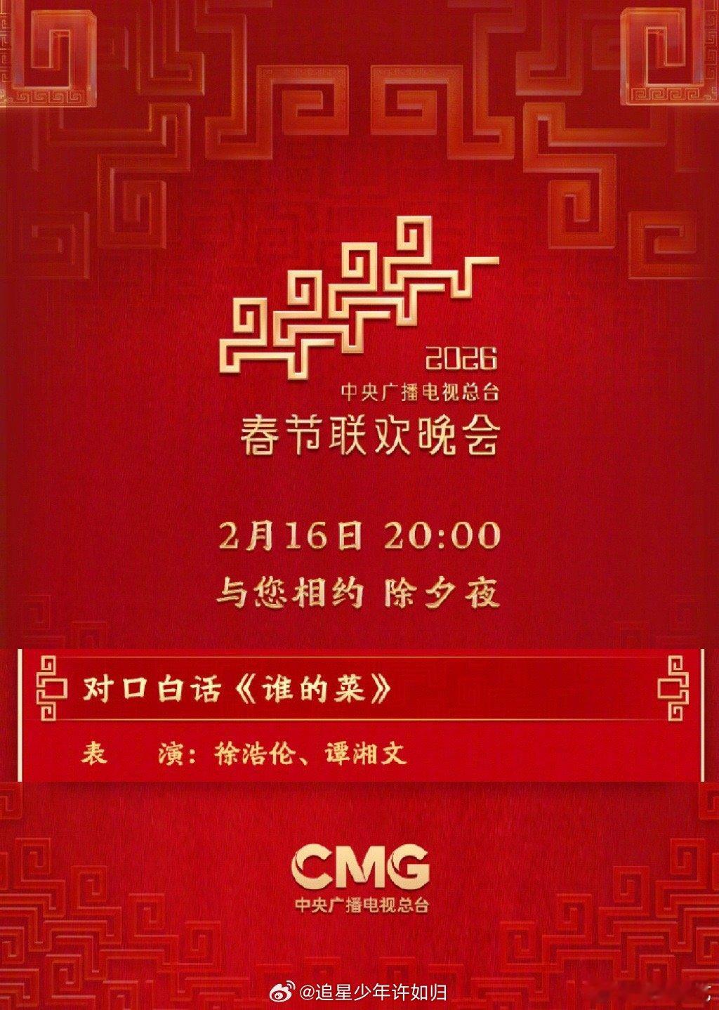 徐浩伦谭湘文二登春晚 徐浩伦谭湘文又上春晚了!二登春晚带来《谁的菜》,不知道这次又会有什么爆笑名场面。搓手期待!