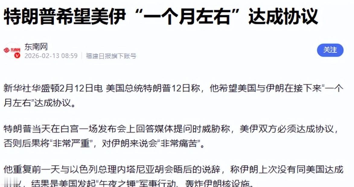 出大事了,特朗普一声令下,美本土遭重创,白宫称美伊或达成协议! 最近国际局势彻底乱了套,特朗普的一道指令,没伤到对手分毫,反倒先让美国本土陷入了困境,而就在民众不满声此起彼伏的时候,白宫又突然放出风声,说美国和伊朗有可能在一个月左右达成协议,这波操作直接看懵了所有人。 可能很多人会疑惑,特朗普到底下了什么命令,能让自己国家的本土遭重创?其实这不是单一指令导致的,而是他近期一系列强硬操作的连锁反应。一方面,为了向伊朗施压,特朗普下令在中东地区大规模部署军事力量,不仅派出了“亚伯拉罕·林肯”号航空母舰,还让五角大楼指示第二个航母打击群做好部署准备,摆出了一副随时要动武的架势。 这种穷兵黩武的做法,首先就给美国本土带来了沉重的经济负担。要知道,部署一艘航母每天的花费就高达数百万美元,更别说两支航母打击群的全套部署,再加上之前对伊朗的制裁,美国相关企业失去了伊朗市场,能源供应也受到影响,国内油价悄然上涨,普通民众加油要多花不少钱,不少依赖伊朗资源的企业更是陷入亏损,直接影响了民生和就业。 除此之外,特朗普下令开展的大规模移民执法行动,也让美国本土遭受了不小的冲击。据权威媒体报道,这场从去年年底开始的执法行动,在明尼苏达州尤为激烈,累计逮捕超过4000人,还先后发生了两起执法人员枪击美国公民的事件,引发了当地民众的持续抗议和集会,局势一度十分紧张。 明尼苏达州州长更是直言,这场执法行动给当地造成了严重伤害,带来了代际创伤,当地经济也因此遭到重创。原本稳定的社会秩序被打破,民众的安全感大幅下降,不少商家因为抗议活动无法正常营业,失业率也出现了小幅上升,这无疑是特朗普指令给本土带来的又一沉重打击。 就在美国本土内忧外患、民众不满情绪不断升级的时候,白宫突然放出了美伊或达成协议的消息,这背后其实全是算计。特朗普在近期的发布会上明确表示,他希望美伊在一个月左右达成协议,还放狠话称,要是谈不拢,后果对伊朗来说会非常严重,甚至还提到了之前美国轰炸伊朗核设施的“午夜之锤”军事行动。 很多人看不透,特朗普一边向伊朗施压、集结军力,一边又主动提协议,其实核心就是为了缓解本土的困境。一方面,要是能和伊朗达成协议,美国就能逐步解除对伊朗的制裁,重新获得伊朗的能源资源,缓解国内能源紧张和油价上涨的问题,同时相关企业也能重新进入伊朗市场,挽回部分损失。 另一方面,美伊关系缓和也能减少美国在中东地区的军事投入,把更多精力放在解决本土问题上,平息民众的不满。只不过,这场协议谈判并没有那么顺利,虽然美伊已经在阿曼举行了首轮间接谈判,伊朗也放出了愿意妥协的信号,提出稀释60%浓缩铀的提议,但双方在核心问题上依然分歧严重。 更关键的是,以色列总理内塔尼亚胡一直在从中作梗,向特朗普提出了四项苛刻条件,要求伊朗彻底拆除核设施、限制弹道导弹项目等,还直言对美伊协议的前景持怀疑态度。而伊朗方面也明确表示,美方必须拿出诚意,要是不讨论制裁问题,谈判很难有实质性进展,甚至还警告美国,一旦遭到攻击,会直接打击美国在中东的军事基地。 现在来看,特朗普的这波操作,本质上就是一场两难的博弈。一边是本土遭受重创,急需通过协议缓解困境;一边是以色列的施压和伊朗的强硬态度,协议谈判举步维艰。至于美伊到底能不能在一个月内达成协议,特朗普能不能靠这场协议挽回本土的损失,平息民众的不满,目前还很难说。但可以肯定的是,特朗普的这一系列指令,已经让美国陷入了内外交困的境地,后续的局势发展,咱们还得持续关注。