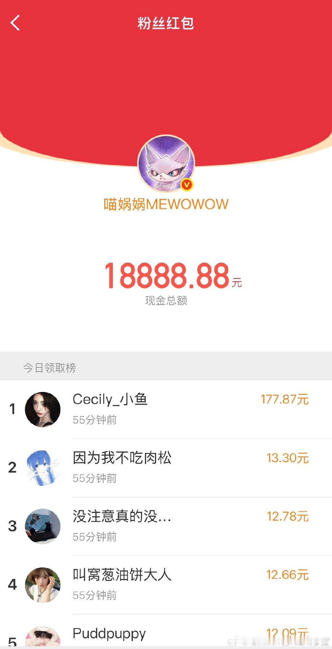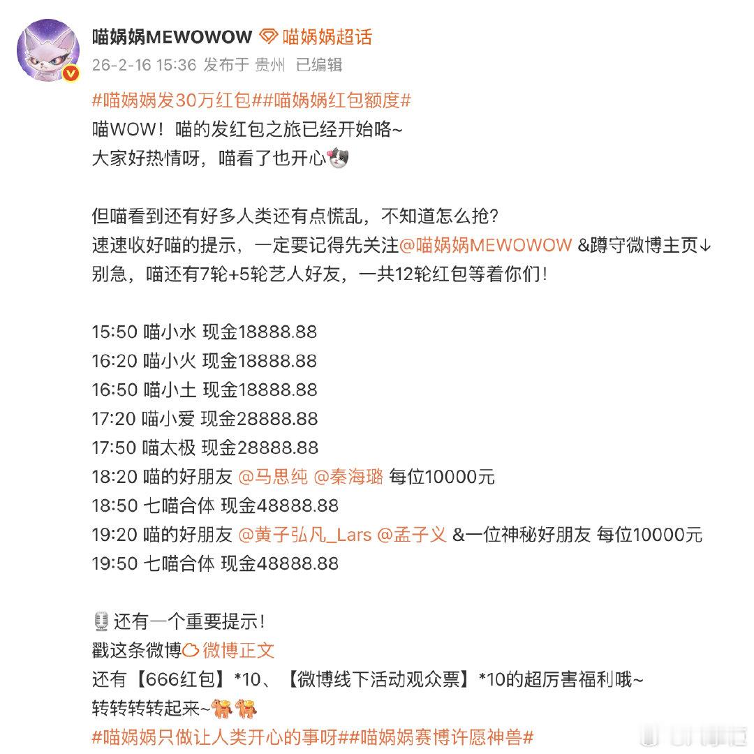 喵娲娲红包额度 救命!我家喵娲娲发红包也太豪横了吧😱 单轮最高48888.88,还有艺人好友加码10000元!这额度谁看了不迷糊?快冲,下一个欧皇就是你!