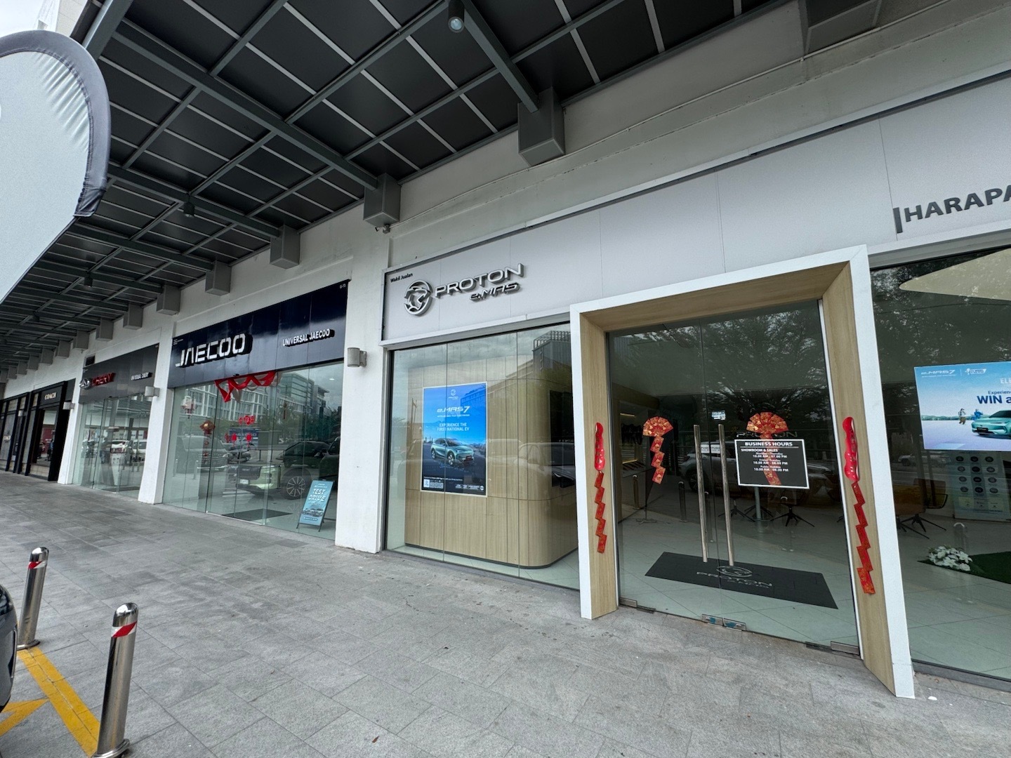 在亚庇最新的商场边上,能看到中国汽车和中国各种品牌出海。JAECOO是奇瑞的,主攻小一些的车,奇瑞主品牌的车更大一些。Proton就是宝腾,吉利在这里的抓手,当地的网约车主力。比亚迪的车在路上可以看见一些,但不多。我去的时间有点早,好像还没怎么开门?