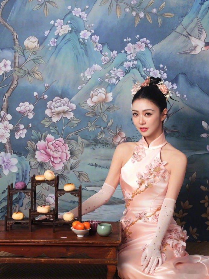 薛凯琪春晚造型簪花仕女图薛凯琪又在春晚穿旗袍了!粉色绣花配工笔背景,古典气质绝了