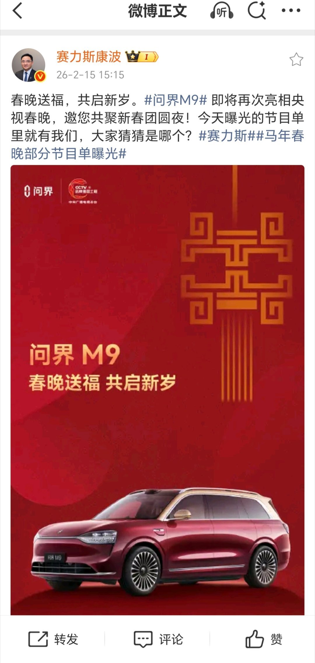 赛力斯集团副总裁康波发文宣布,鸿蒙智行问界 M9 汽车将再次亮相央视春晚,已曝光的节目单里就有问界。