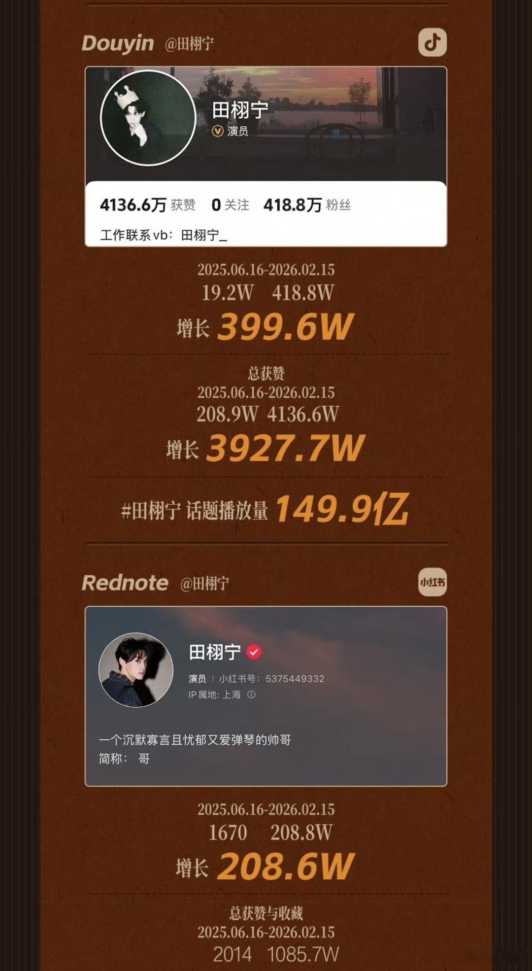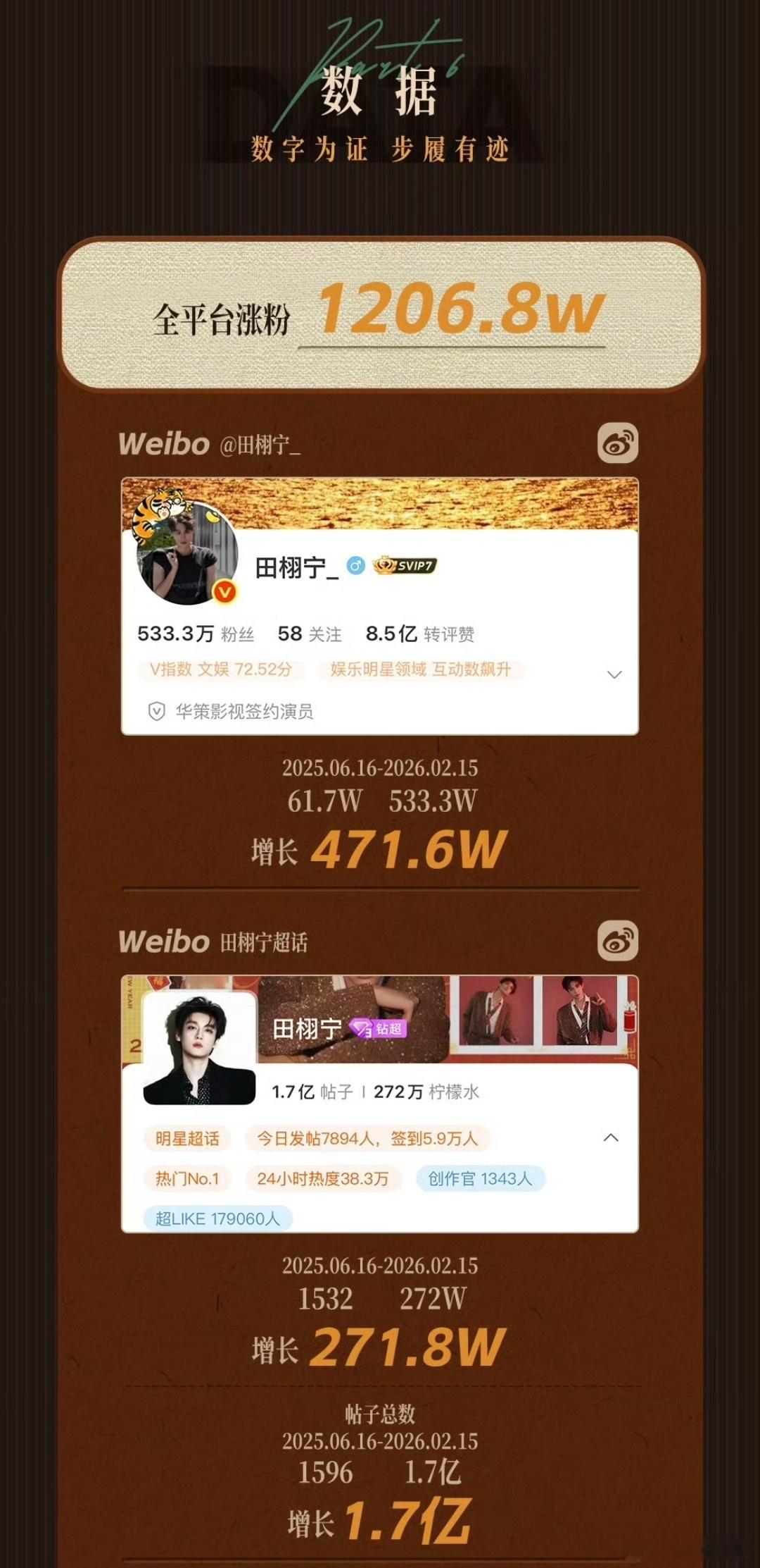 田栩宁工作室发年度总结田栩宁工作室发布「2025年度总结」商务实绩+杂志时尚+活动+数据+奖项+公益!音乐——《光焰》个人首支生日单曲!数据——全平台涨粉1206.8w!全网热搜5200+!22次登顶世界趋势!奖项——微博年度星光人物入围+《光焰》微博网友年度喜爱音乐!2026交给时间,未完待栩!田栩宁全平台涨粉1206.8w田栩宁2025年度报告田栩宁