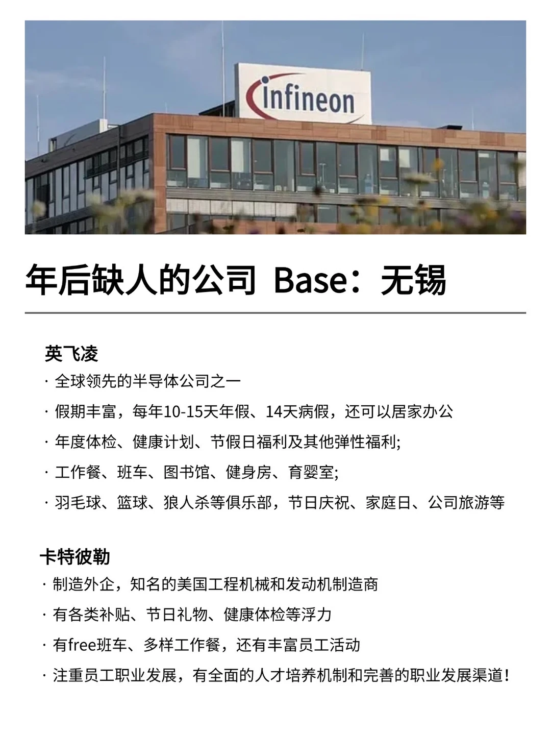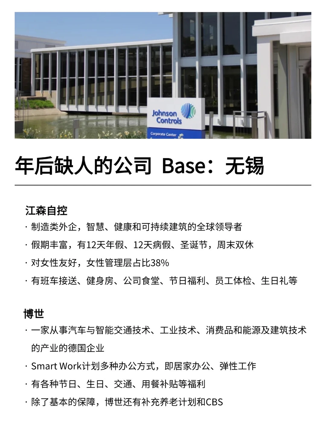 无锡发展真的越来越好,有不少小而美、冷门宝藏的公司,机会是真的很多的! 特别是有不少小众冷门的外企,真心建议大家可以去试试 · 大家不要觉得外企很难进 其实外企也有一些常规类、英语要求没有那么高的岗位 · 为什么还是值得去外企? ▪️氛围好,对女性友好,年假长,基本上都是10天起步 ▪️很多还都支持居家办公、福利完善,是真的能实现WLB ▪️待遇也还不错,年后找工作的真的可以考虑考虑~ · 坚持日更✊🏻,帮大家在找工作路上顺利拿 offer! ·