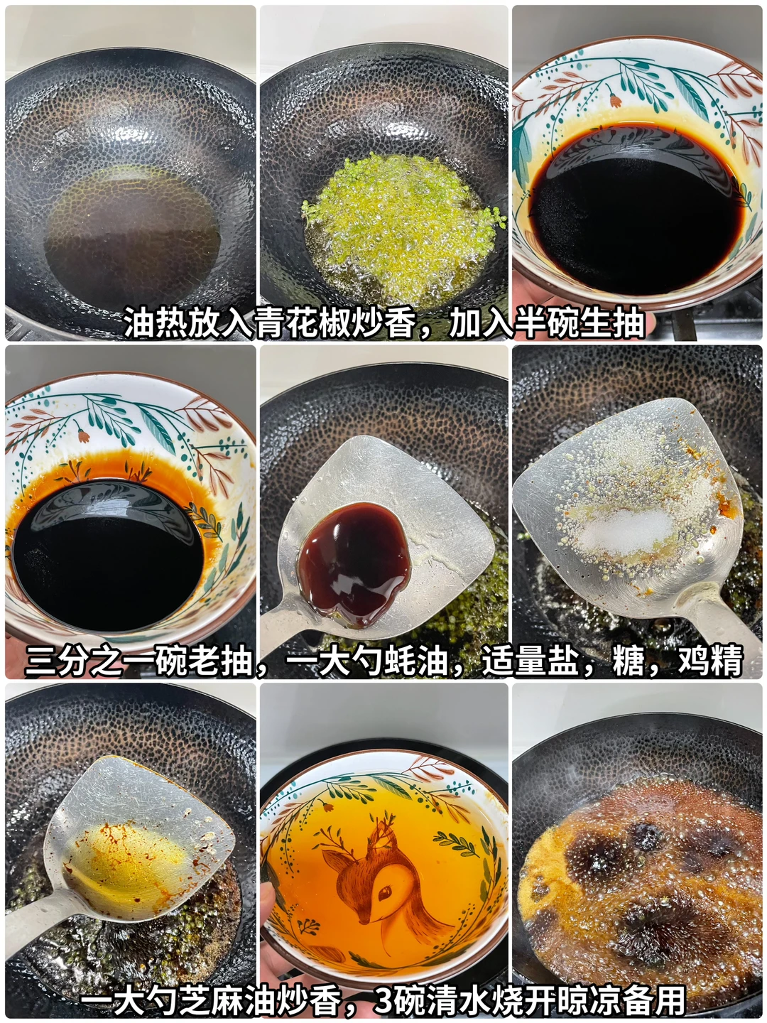 1⃣️我们先熬酱汁:起锅烧油,油热,放入多多青花椒炒香,加入半碗生抽,1/3碗老抽,1大勺蚝油,适量的盐、糖、鸡精,1大勺芝麻油炒出香味,加入3碗清水烧开。晾凉备用。(我这里是2斤鸡爪的量)